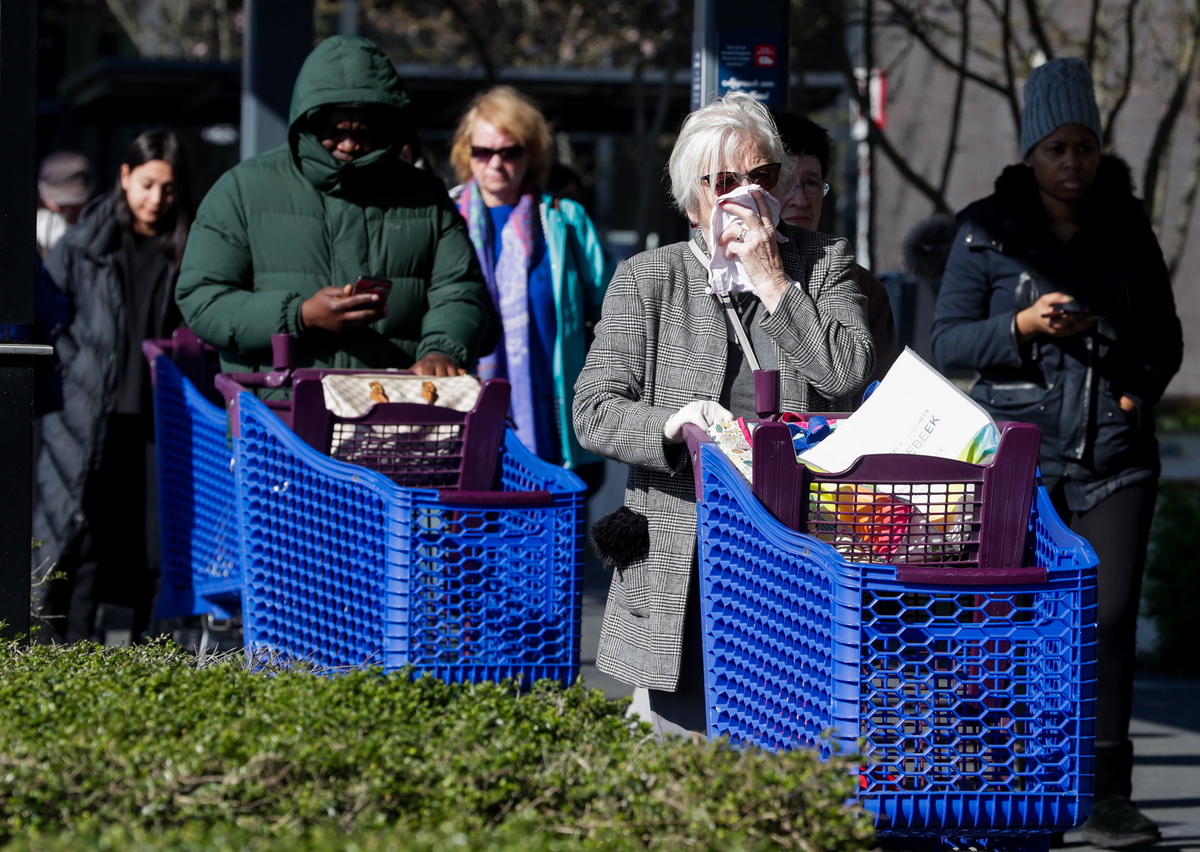 epa08302930 People queue in front of a supermarket in Drogenbos, Belgium, 18 March 2020. Belgium is implementing confinement guidelines for the public which a scheduled to be in place until 05 April 2020. Only supermarkets and essential trade will remain open. EPA/STEPHANIE LECOCQ