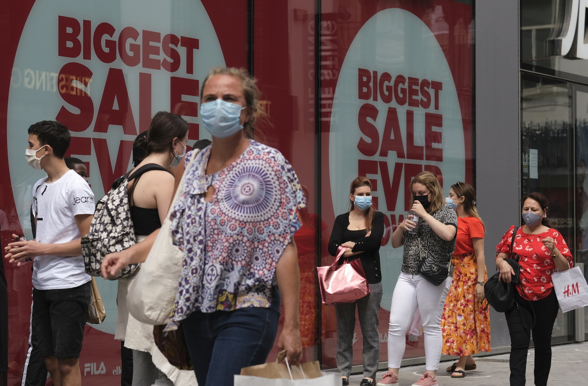 epa08582029 Masked shoppers in the main Shopping street of Brussels at the third day of the summers sales, in Belgium, 03 August 2020. Media reports a really bad start for summer sales. After being moved from July to August. Few days ahead to the start of Summer sales, Belgium government, due to a second wave of Coronavirus hitting Belgium, announced shopping will be only open to one adult only and for a maximum of 30 minutes. As well, protective face mask is now mandatory in all city centers. EPA/OLIVIER HOSLET