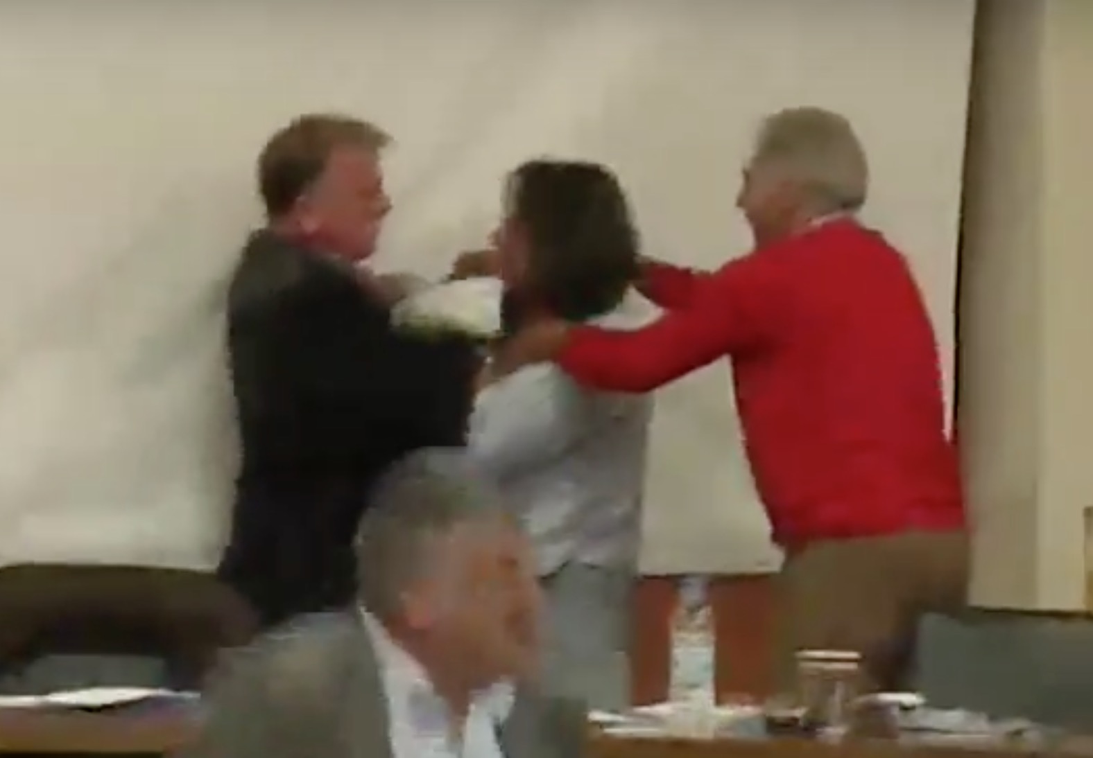 Οι δύο άνδρες άρχισαν να σπρώχνουν ο ένας τον άλλο μπροστά στα μάτια των έκπληκτων συναδέλφων τους και να παλεύουν μεταξύ τους. Δημοτικοί σύμβουλοι μπήκαν στη μέση για να τους χωρίσουν ενώ η συνεδρίαση διεκόπη προκειμένου να ηρεμήσουν τα πνεύματα.