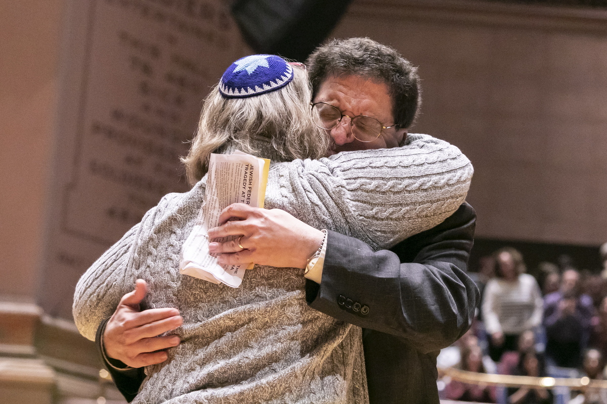 epa07128259 Community members gather at Sodiers and Sailors Memorial Hall for a vigil for the victims of the mass shooting at the Tree of Life synagogue, in Pittsburgh, Pennsylvania, USA, 28 October 2018. According to media reports, 11 people were killed by the gunman, identified as Robert Bowers, who has been charged with hate crimes and other federal charges. EPA/ADAM SCHULTZ