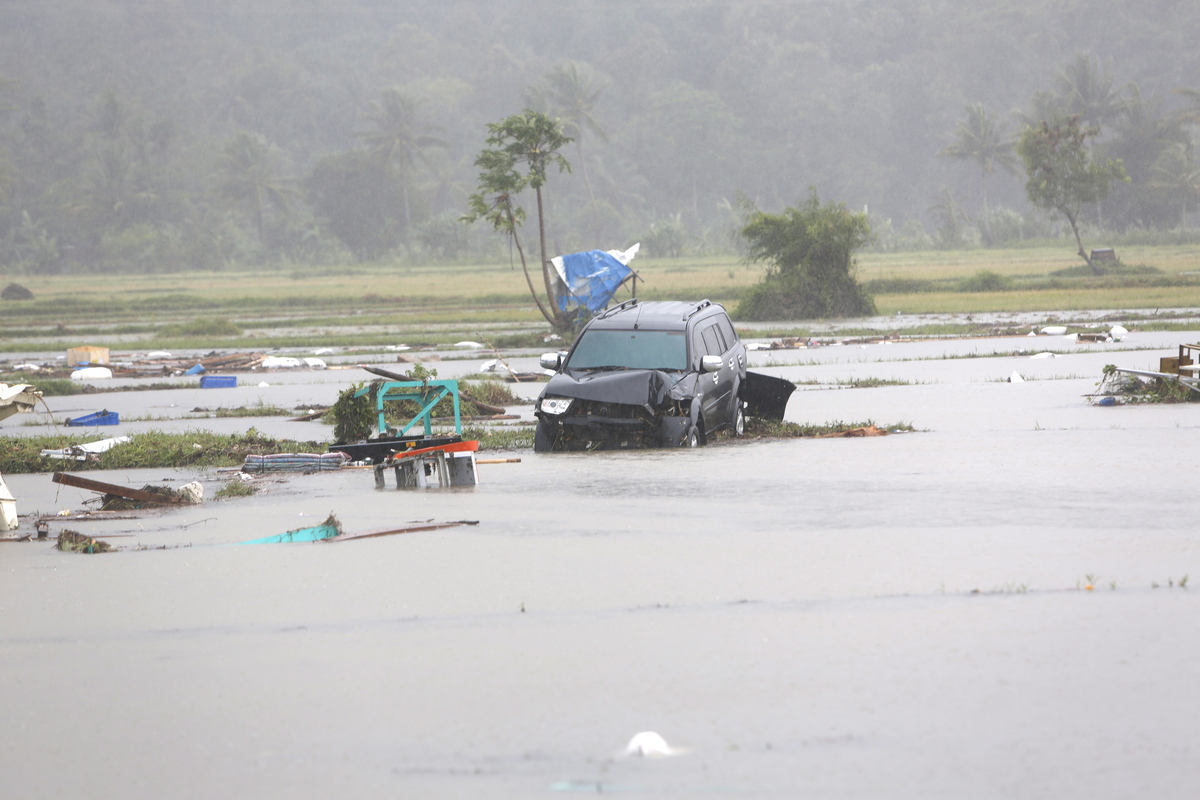 epa07246189 A ruined vehicle sits in the water after a tsunami hit Sunda Strait in Anyer, Banten, Indonesia, 23 December 2018. According to the Indonesian National Board for Disaster Management (BNPB), at least 43 people dead and 584 others have been injured after a tsunami hit the coastal regions of the Sunda Strait. EPA/ADI WEDA