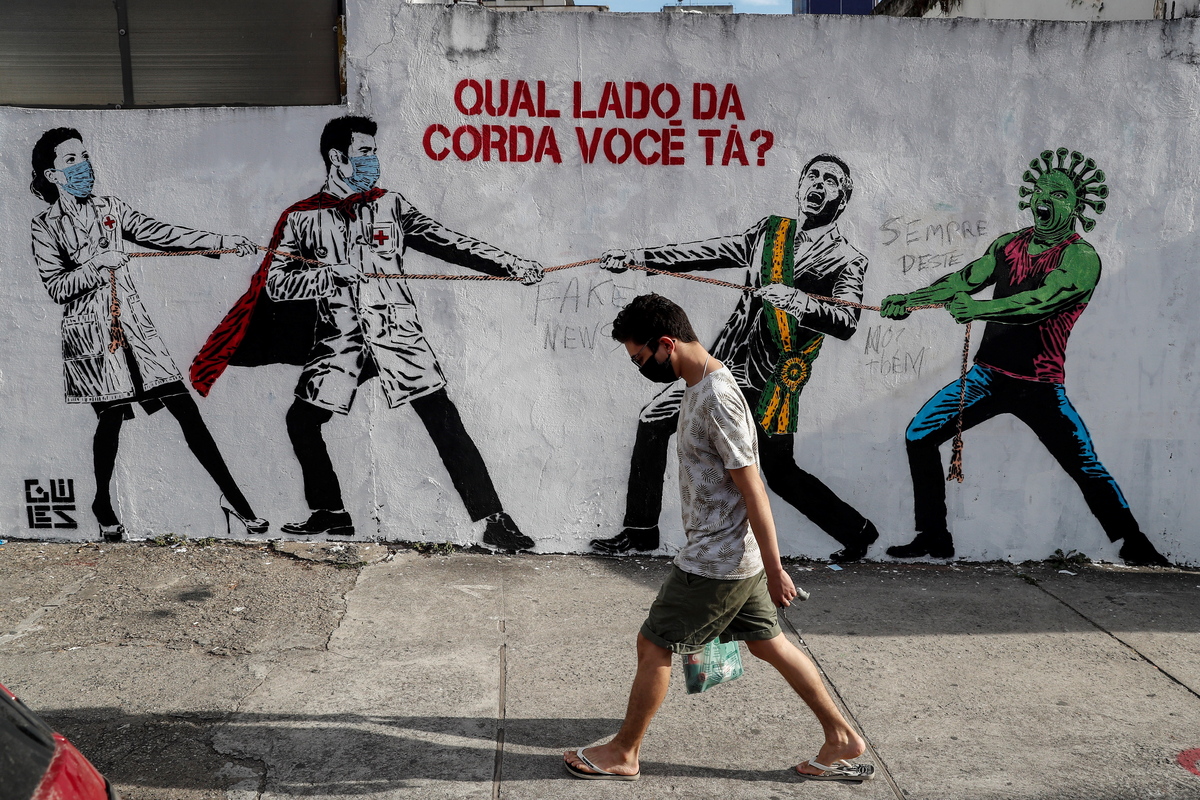 epa08504708 A man passes in front of a graffiti that represents Brazilian President Jair Bolsonaro and a figure that represents the novel coronavirus COVID-19 pulling a rope against health workers with a message that says: 'Which side of the rope are you on?' in Sao Paulo, Brazil, 23 June 2020. EPA/Sebastiao Moreira