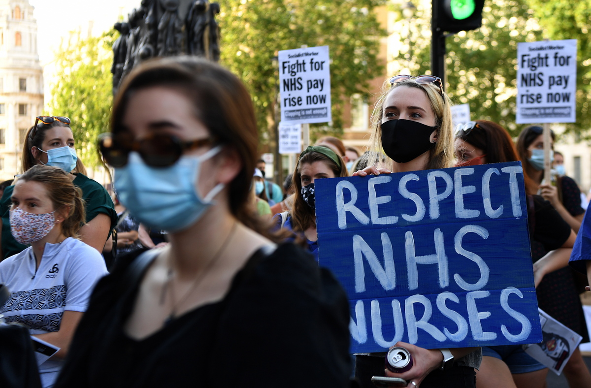 epa08572985 NHS nurses wearing protective face masks stage a protest march to Downing Street in London, Britain, 29 July 2020. NHS nurses who have been on the frontline for some five months fighting Coronavirus marched to Downing Street calling for a pay rise. EPA/ANDY RAIN