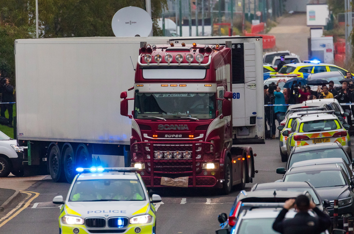 epa07943548 Police drive the lorry container along the road from the scene in Waterglade Industrial Park in Grays, Essex, Britain, 23 October 2019. A total of 39 bodies were discovered inside a lorry container in the early hours of this morning, and pronounced dead at the scene. EPA/VICKIE FLORES
