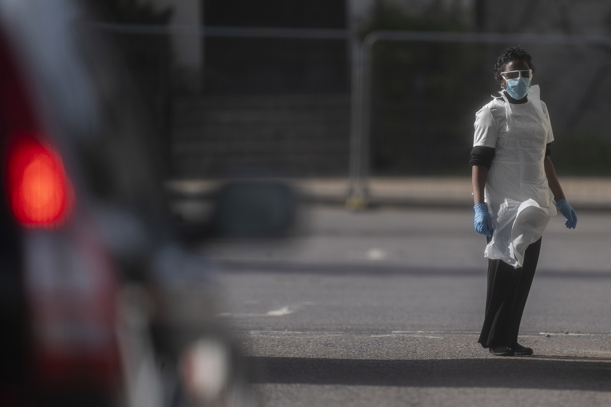 epa08330519 A medical worker at an NHS drive through coronavirus disease (COVID-19) testing facility at Chessington World of Adventures, London, Britain, 29 March 2020. According to news reports the NHS is anticipating a Coronavirus 'tsunami' as the peak of infarction rates nears. British Prime Minister Boris Johnson has announced that Britons can only leave their homes for essential reasons or may be fined, in order to reduce the spread of the Coronavirus COVID-19. EPA/WILL OLIVER