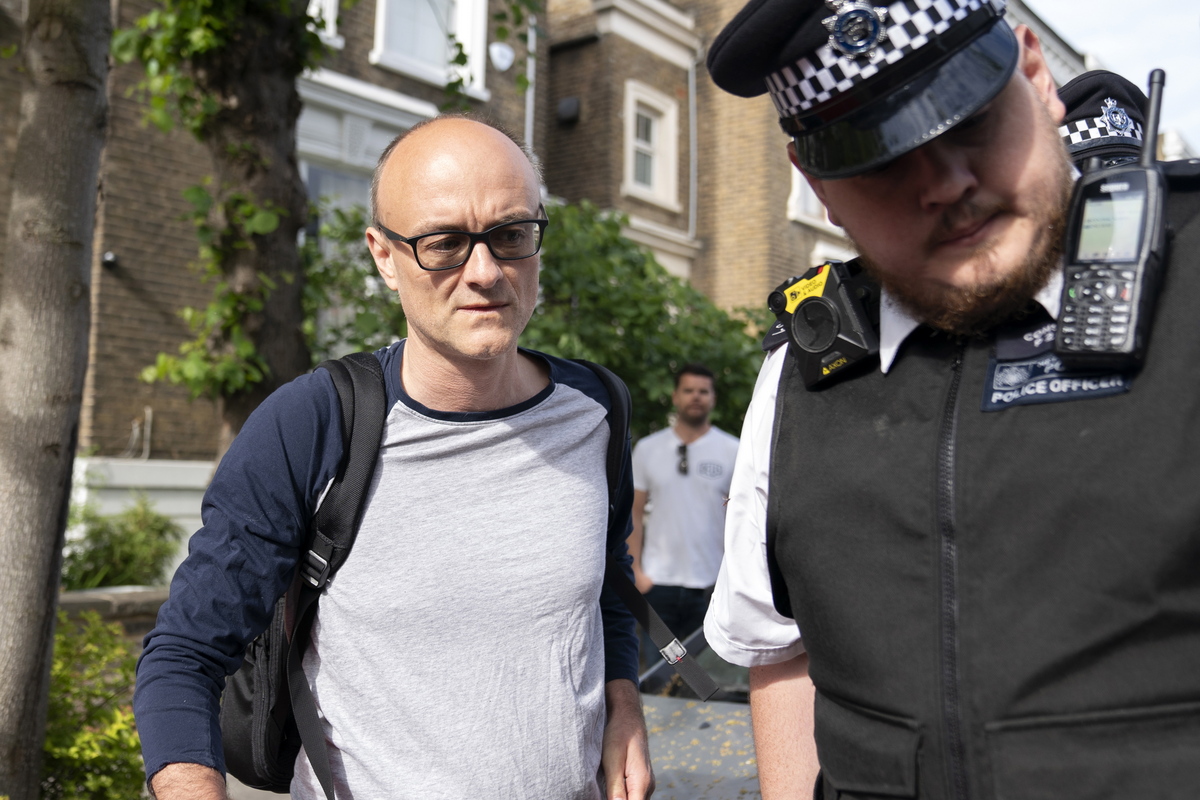 epa08444219 British Prime Minister Boris Johnson's Special Advisor Dominic Cummings (L) leaves his home in London, Britain, 26 May 2020. Calls for Cummings' resignation have increased since news broke that he broke lockdown regulations while showing symptoms for COVID-19. EPA/WILL OLIVER