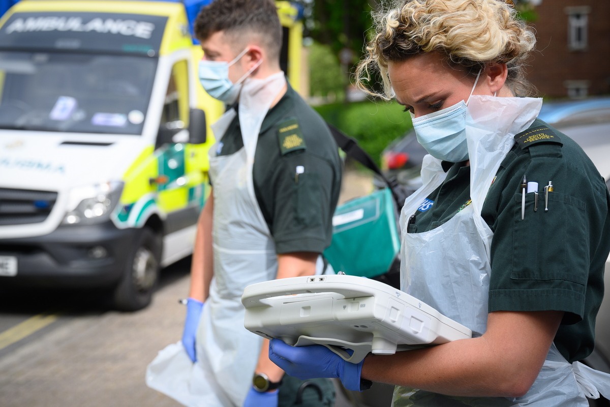 epa08407512 An ambulance crew from the South Central Ambulance Service wear protective clothing as they complete the digital paperwork after responding to a false alarm call for a heart attack in Portsmouth, Britain, 05 May 2020 (issued 07 May 2020).. Due to the risk of contamination to the air ambulance helicopters, patients have been transferred to the mainland using the hovercraft service since the beginning of May. As the list of recognised Covid-19 symptoms grows, paramedic crews like those with the South Central Ambulance Service are forced to treat every patient as being a potential case, often requiring specialised personal protective equipment (PPE). Paramedics now routinely don what the NHS refers to as Level 2 PPE, like face masks and disposable aprons. Cases with patients potentially needing airway procedures require Level 3 PPE, such as full-face visors and long-sleeved surgical gowns. While the infection rate is falling, and government officials are discussing ways to relax the country's quarantine measures, Covid-19 still creates everyday risks for paramedics and other first responders. EPA/Leon Neal / POOL