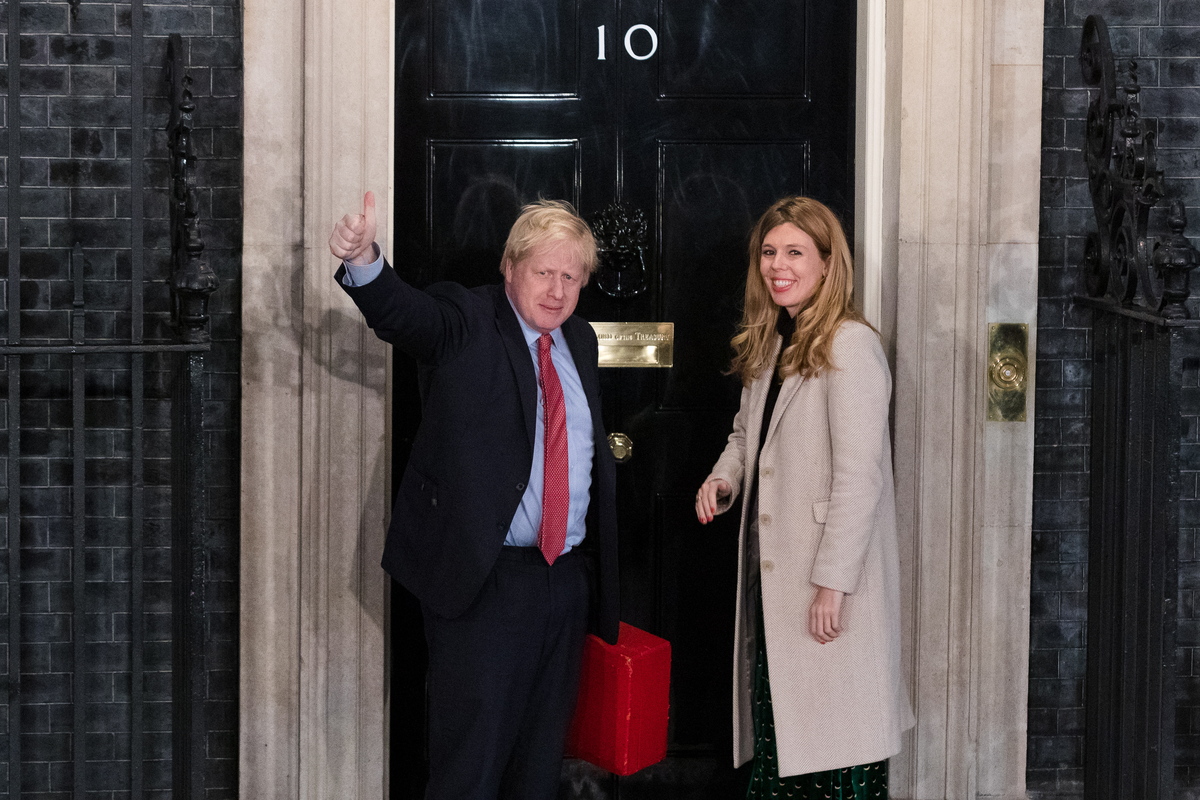epa08067987 British Prime Minister Boris Johnson and his girlfriend Carrie Symonds arrive back in 10 Downing Street in London, Britain, 13 December 2019. Britons went to the polls for a general election on 12 December 2019, which the Conservative Party led by British Prime Minister Boris Johnson has won with an overall majority. EPA/VICKIE FLORES