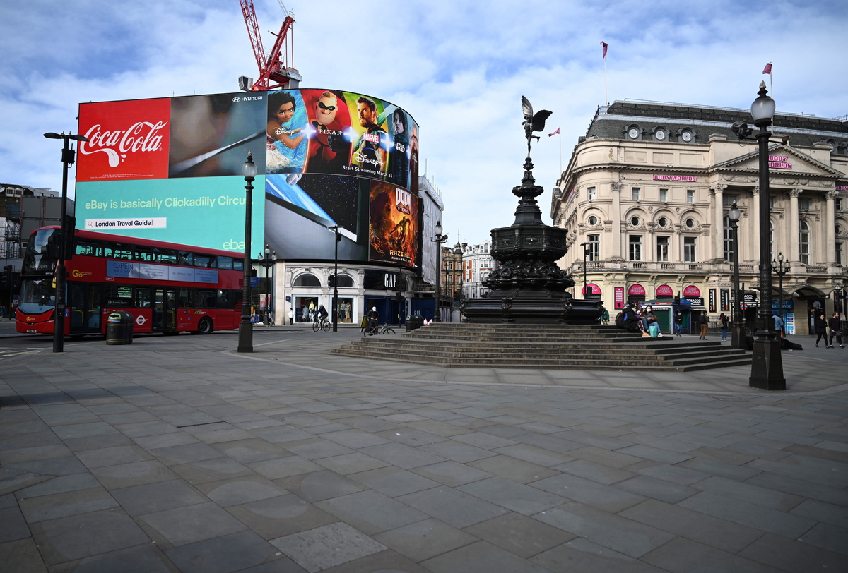 epa08311928 An unusually empty Piccadily Circus on a Saturday afternoon in London, Britain, 21 March 2020. Britain's Prime Minister Boris Johnson has urged UK citizens to avoid unnecessary social contacts, to work from home where possible, and to close schools, pubs and restaurants. Several European countries have closed borders, schools as well as public facilities, and have cancelled most major sports and entertainment events in order to prevent the spread of the SARS-CoV-2 coronavirus causing the Covid-19 disease. EPA/NEIL HALL