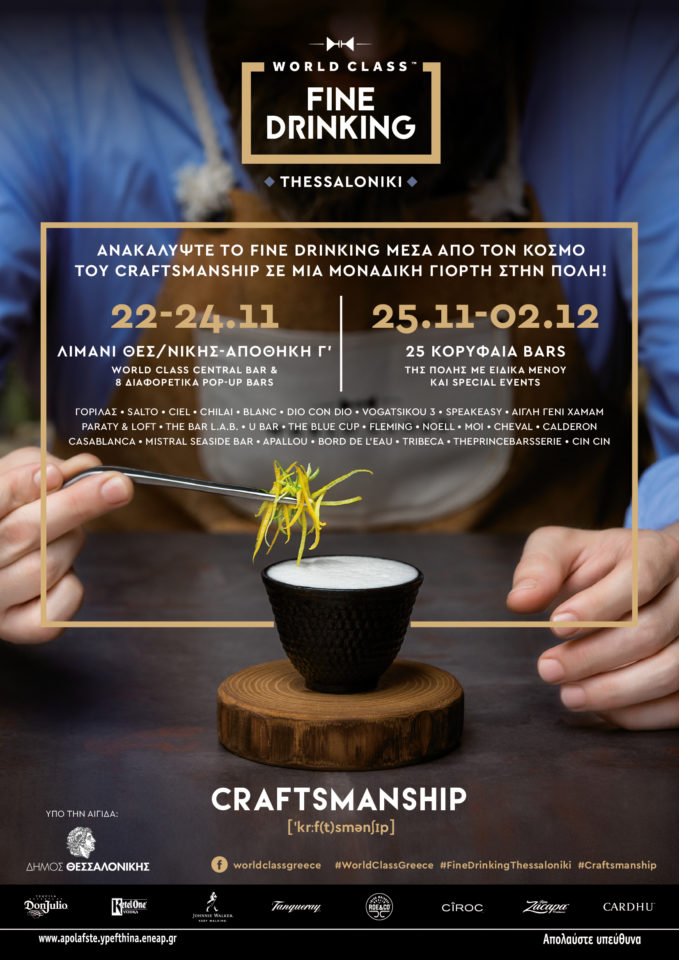Το World Class Fine Drinking την Πέμπτη 22, Παρασκευή 23 και Σάββατο 24 Νοεμβρίου, στο λιμάνι της Θεσσαλονίκης – Αποθήκη Γ’ και ώρα 20.30-1.30 σας περιμένει μαζί με 25 κορυφαία bar της πόλης, καταξιωμένους bartenders, συναρπαστικά serves, live μουσική κι άλλες εκπλήξεις.