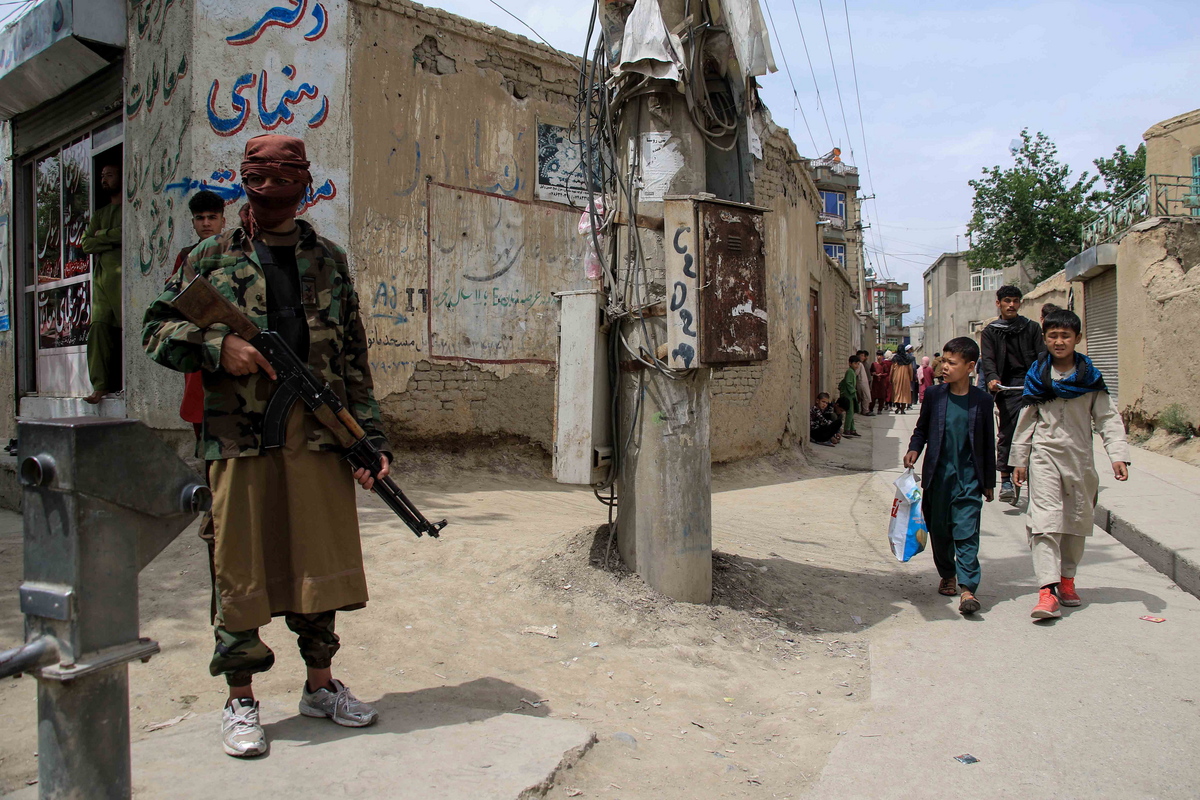 epaselect epa09896905 Taliban stand guard in an area surrounding a school in the aftermath of multiple bomb blasts in a Shi'ite majority neighborhood, in Kabul, Afghanistan, 19 April 2022. At least four people were killed and several others were injured in consecutive suspected suicide blasts. EPA/STRINGER