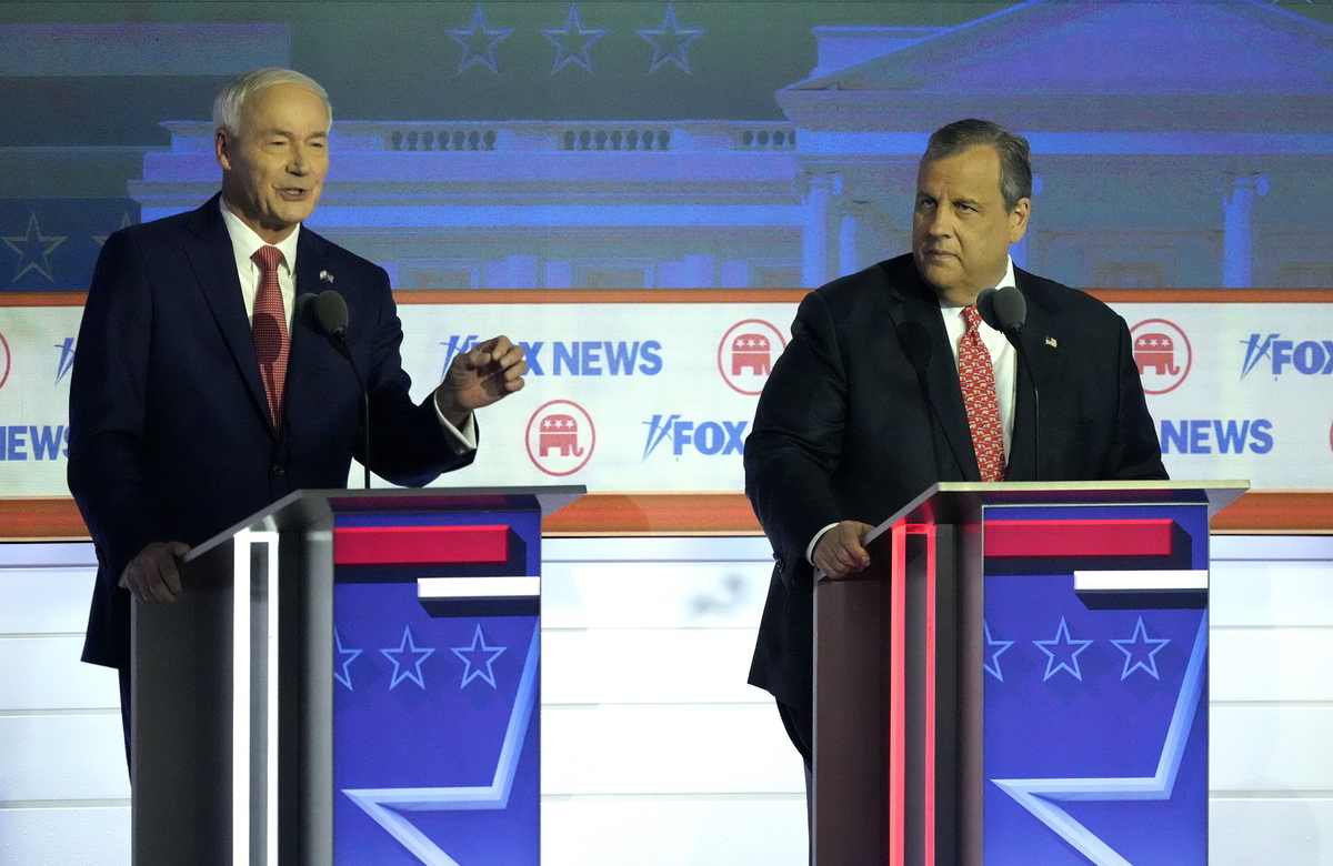 epa10816818 Republican candidate for President Arkansas Governor Asa Hutchinson (L) answers a question as Former New Jersey Governor Chris Christie (R) listens in during the Republican presidential debate, hosted by Fox News and moderated by Bret Baier and Martha MacCallum, at the Fiserv Forum in Milwaukee, Wisconsin, USA, 23 August 2023. A total of eight GOP primary candidates of the 14 declared, are taking part in the debate, with former US President Donald Trump opting not to participate. EPA/MIKE DESISTI / POOL SHUTTERSTOCK OUT EDITORIAL USE ONLY/NO SALES