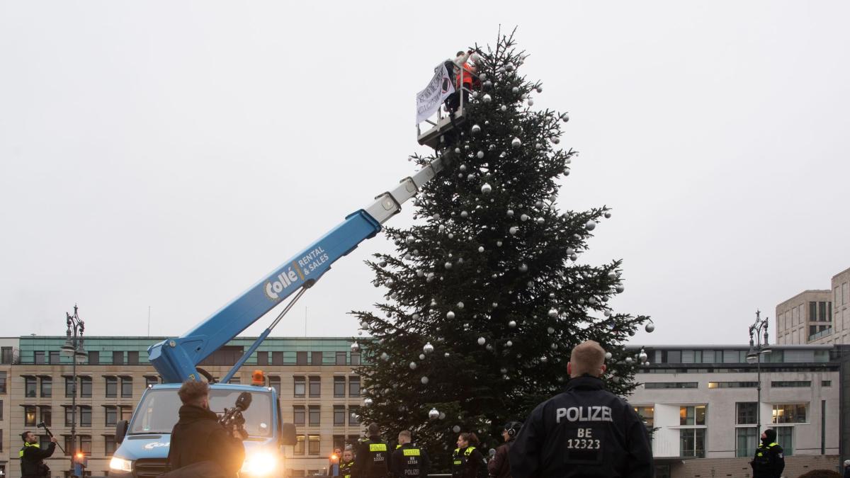 Ακτιβιστές της οργάνωσης Letzte Generation (Τελευταία Γενιά) χρησιμοποίησαν υδραυλικό ανυψωτικό μηχάνημα για να φθάσουν στην κορυφή του ύψους 15 μέτρων στολισμένου ελάτου σε ένα από τα πιο ιστορικά σημεία του Βερολίνου.