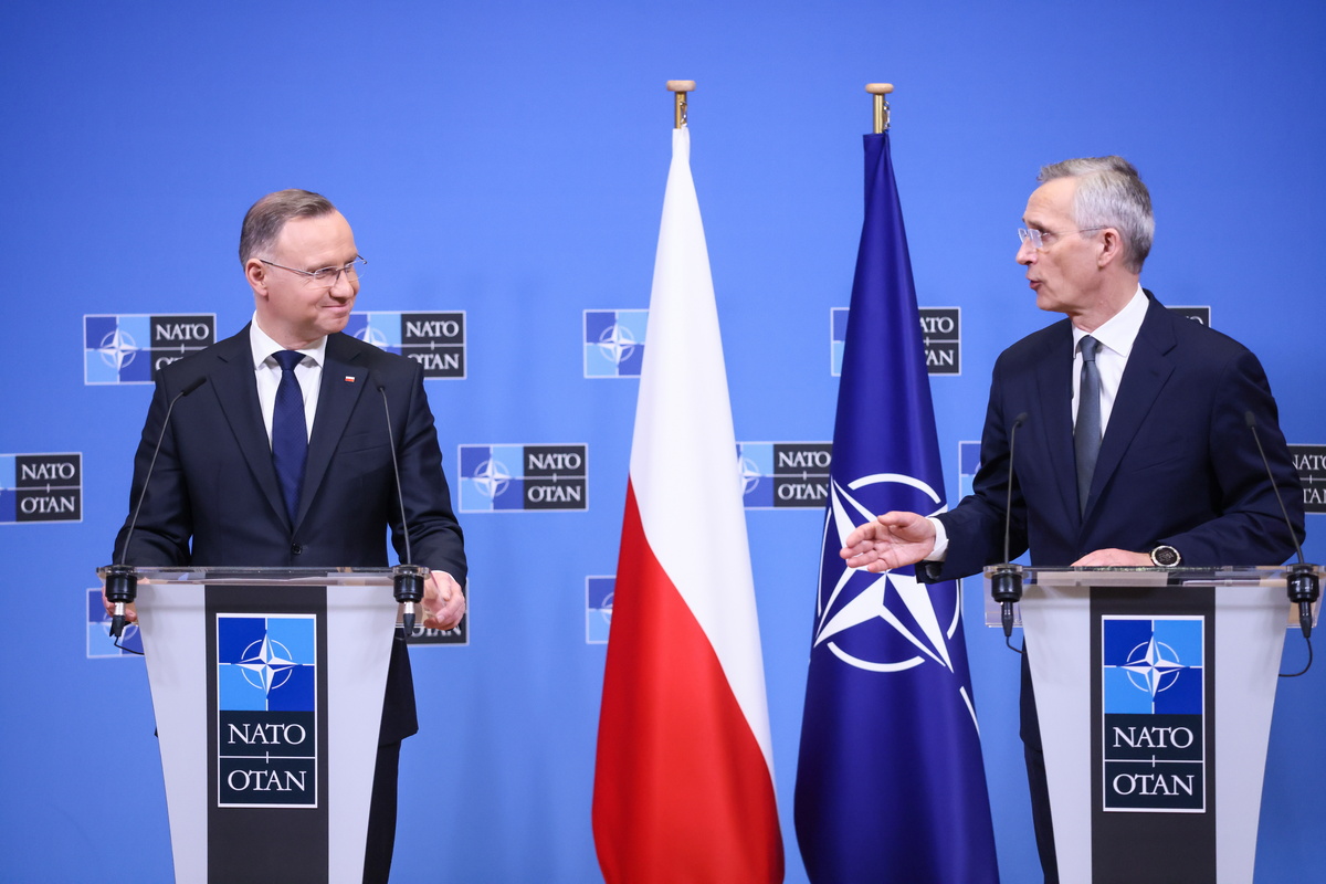 epa11220361 NATO Secretary General Jens Stoltenberg (R) and Polish President Andrzej Duda (L) attend a joint press conference after their meeting at the NATO headquarters in Brussels, Belgium, 14 March 2024. Their meeting comes two days after the 25th anniversary of Poland's accession to NATO. EPA/LESZEK SZYMANSKI POLAND OUT