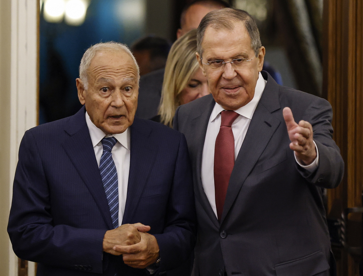 epa10909099 Russian Foreign Minister Sergei Lavrov (R) welcomes the Secretary-General of the Arab League, Ahmed Aboul Gheit, during their meeting in Moscow, Russia, 09 October 2023. EPA/SERGEI ILNITSKY