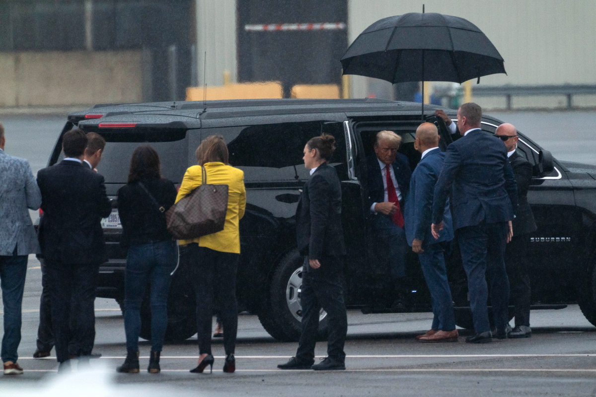 epa10783778 Former US President Donald J. Trump (C-R) arrives at Ronald Reagan Washington National Airport after Judge Tanya Sue Chutkan arraigned him in Washington, in Arlington, Virginia, USA, 03 August 2023. A federal grand jury has indicted Trump over his efforts to overturn the 2020 presidential election. EPA/ERIC LEE