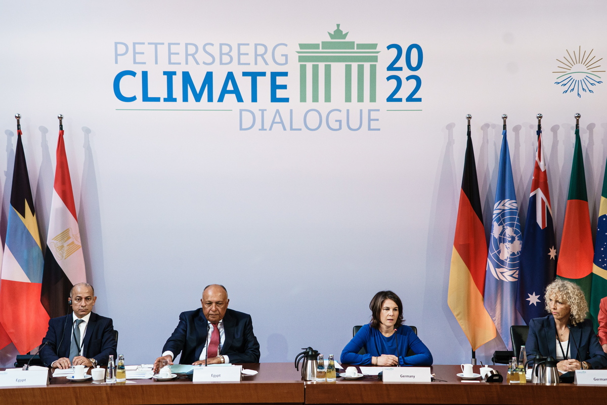 epa10077232 (L-R) Special representative to the COP27 president Wael Aboulmagd, Egyptian Foreign Minister Sameh Shoukry, German Federal Foreign Minister Annalena Baerbock and State Secretary and Special Envoy for International Climate Action at the Federal Foreign Office Jennifer Morgan deliver remarks at the Petersberg Climate Dialogue meeting at the Foreign Ministry in Berlin, Germany, 18 July 2022. The two-day Petersberg Climate Dialogue takes place in Berlin on 18-19 July and is co-chaired by Germany and Egypt. EPA/CLEMENS BILAN