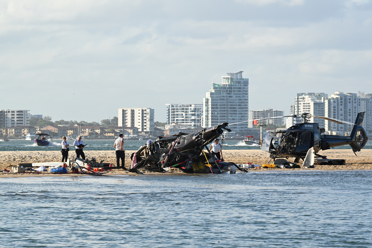 epa10386025 Police inspect a helicopter at the scene of a helicopter collision near Seaworld, on the Gold Coast, Australia, 02 January 2023. Four people are dead and another 13 injured after two helicopters collided before one crashed into the Broadwater on the Gold Coast. EPA/DAVE HUNT AUSTRALIA AND NEW ZEALAND OUT