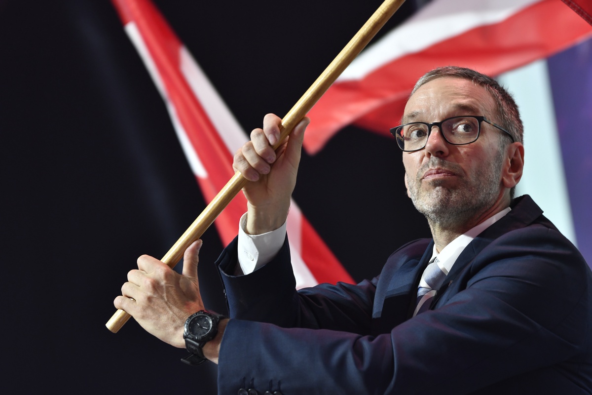 epa09285526 Former Austrian Interior minister, Herbert Kick, and new leader of the right-wing Austrian Freedom Party (FPOe) waves flag during a party convention in Wiener Neustadt, Austria, 19 June 2021. The FPOe party executive committee voted with 88.24 percent of the vote for former Interior Minister Herbert Kickl as new party leader after former FPOe leader Norbert Hofer resigned on 01 June 2021. EPA/Daniel Novotny