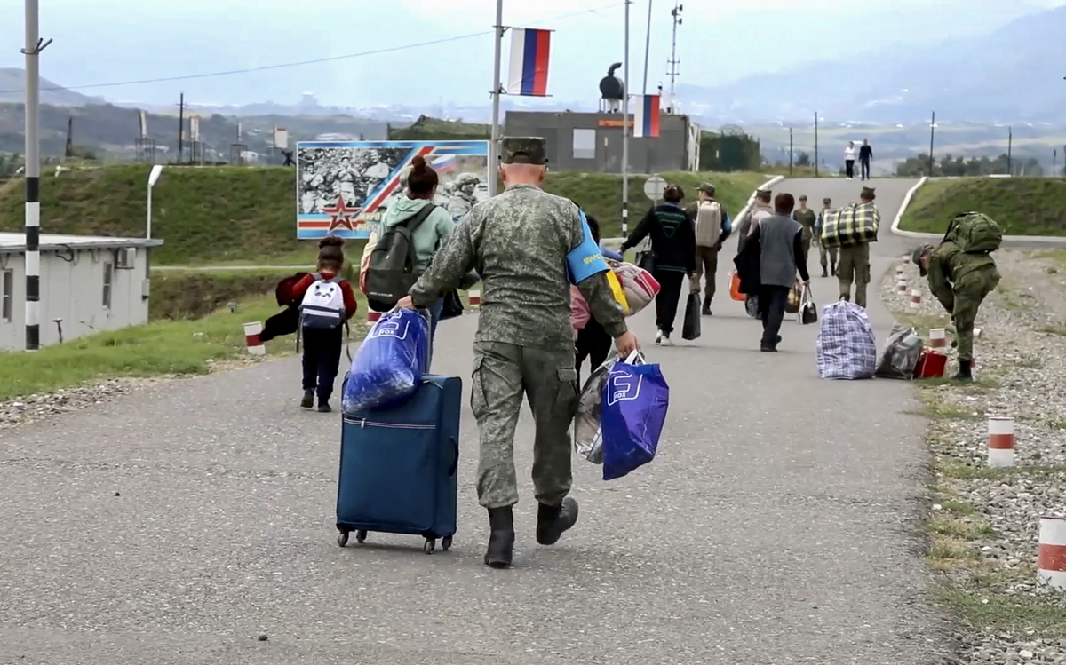 epa10874835 A still image taken from a handout video provided by the Russian Defence Ministry press-service shows civilians at the Russian peacekeepers' camp near Stepanakert, Nagorno-Karabakh, 21 September 2023. About 5,000 people have been brought to the location of the Russian peacekeeping contingent as Russian peacekeepers have evacuated civilians from Martakert, Martuni, and Askeran districts of Nagorno-Karabakh, the Russian Defence Ministry announced on 21 September. Azerbaijan government's announced that a ceasefire was agreed with Armenian separatists in Nagorno-Karabakh on 20 September, after a 24-hour military offensive to take control of the enclave. EPA/RUSSIAN DEFENCE MINISTRY PRESS SERVICE HANDOUT MANDATORY CREDIT -- BEST QUALITY AVAILABLE HANDOUT EDITORIAL USE ONLY/NO SALES