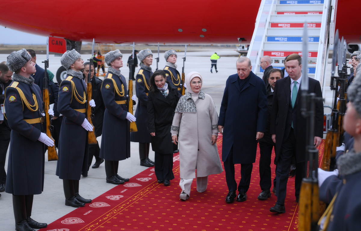 epa11677195 A handout photo made available by photo host brics-russia2024.ru shows Turkish President Recep Tayyip Erdogan and his wife Emine Erdogan attend a welcoming ceremony upon his arrival at Kazan International Airport at the BRICS summit in Kazan, Russia, 23 October 2024. The BRICS summit takes place from 22 to 24 October. EPA/ILYA PITALEV / BRICS-RUSSIA2024.RU HANDOUT HANDOUT EDITORIAL USE ONLY/NO SALES