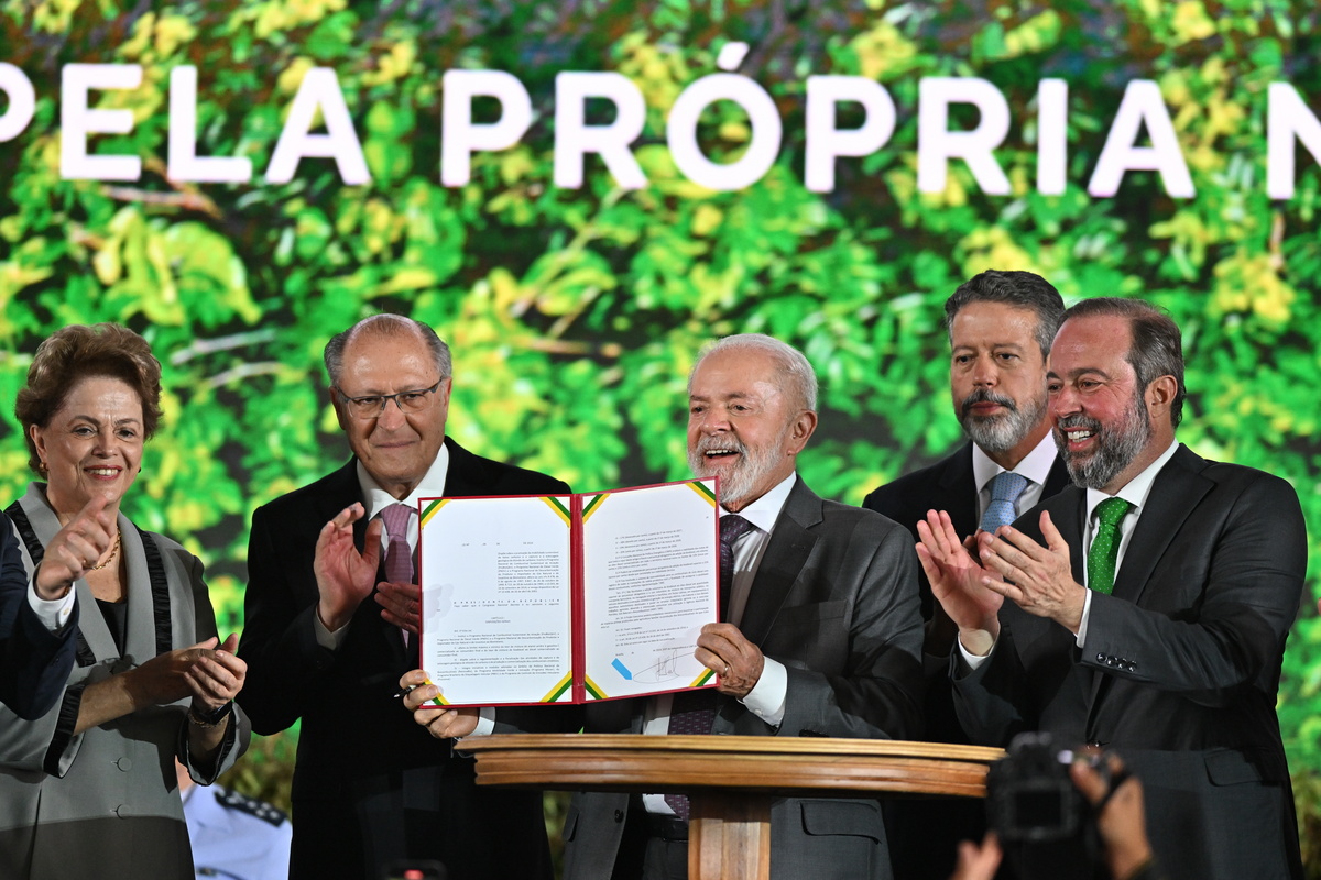 epa11649724 (L-R) The president of the BRICS Bank and former president of Brazil, Dilma Rousseff; Vice President Geraldo Alckmin; President Luiz Inacio Lula da Silva; President of the Chamber of Deputies, Arthur Lira; and Minister of Mines and Energy, Alexandre Silveira, pose during a ceremony at the Military Air Base in Brasília, Brazil, 08 October 2024. Lula da Silva signed a bill to advance the decarbonization of transportation and prevent the emission of 705 million tons of carbon dioxide (CO2) by 2037, through the development of biofuels. EPA/Andre Borges