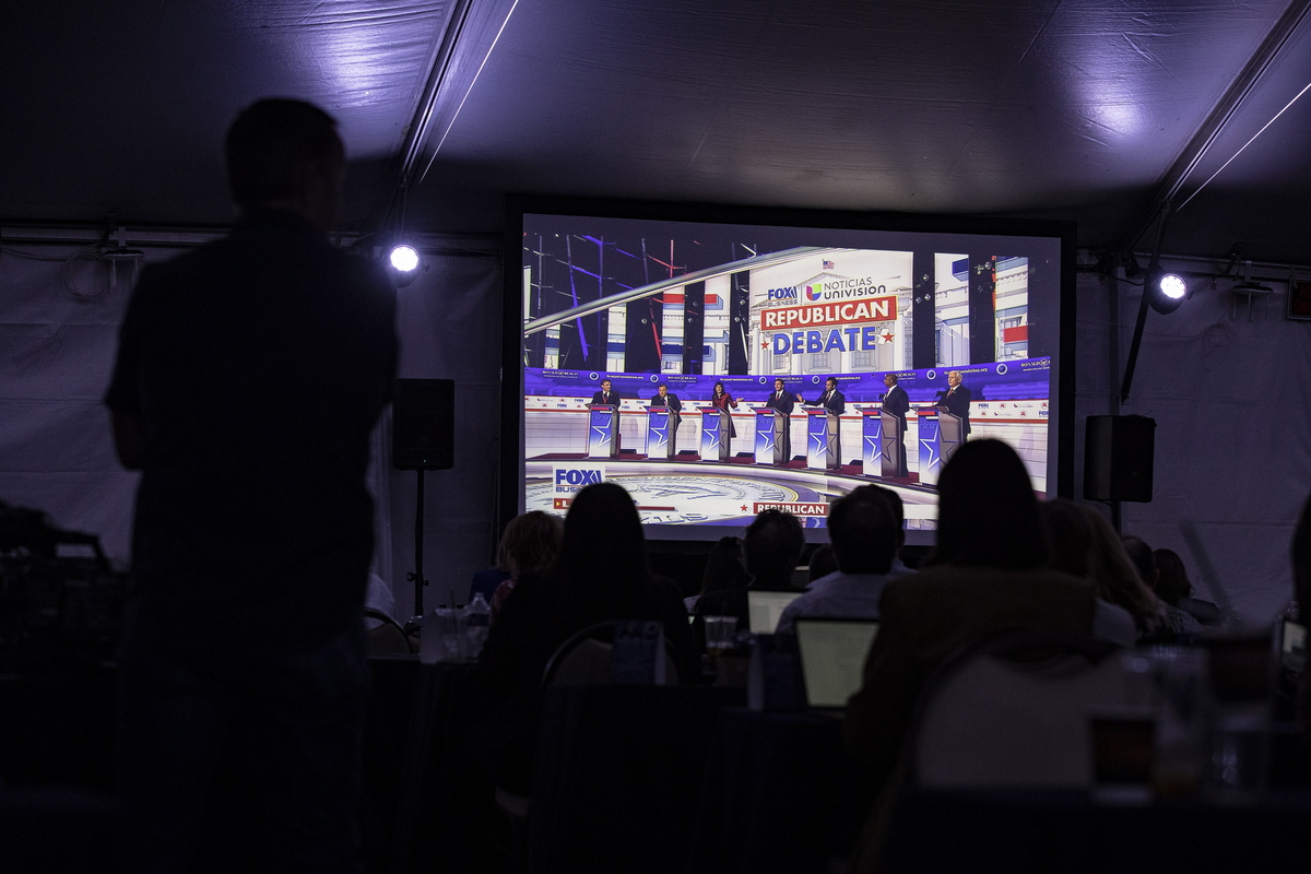 epa10886927 Journalists watch the GOP FOX Business Presidential Debate, in a nearby tent at the Ronald Reagan Presidential Library in Simi Valley, California, USA, 27 September 2023. EPA/ETIENNE LAURENT
