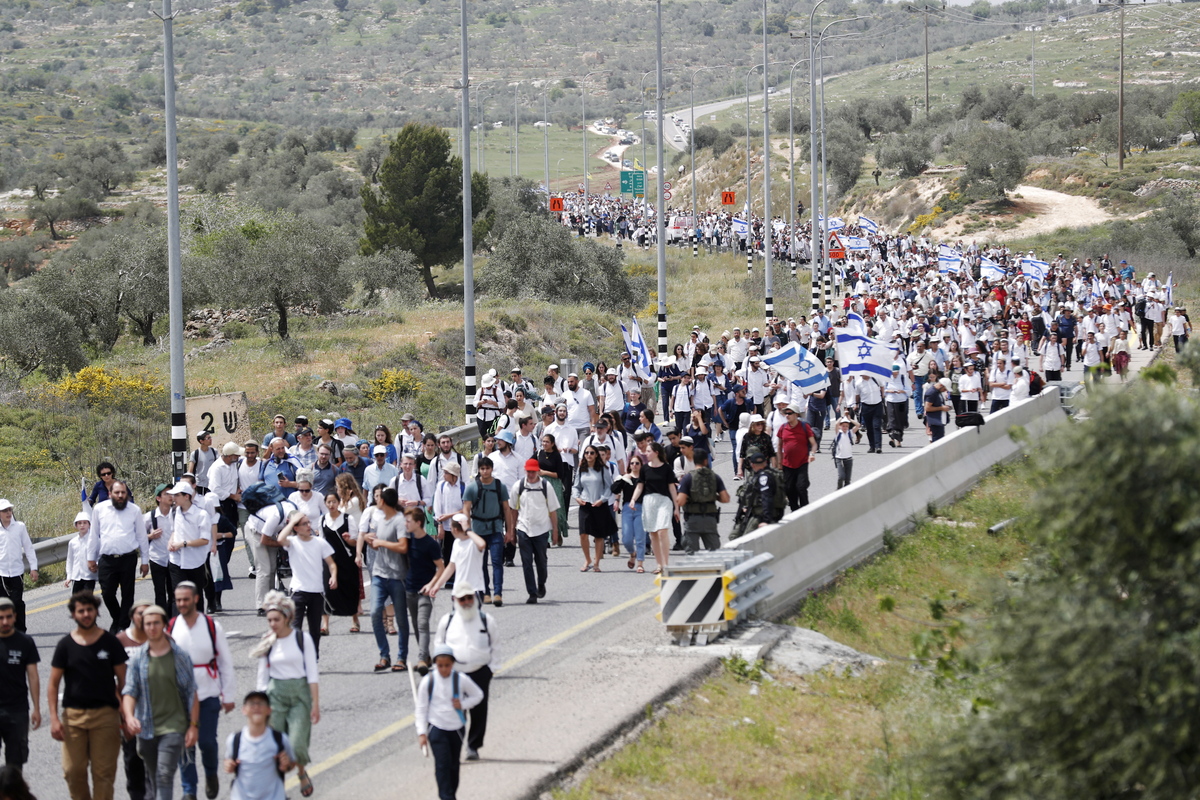epa10567433 Israeli far-right supporters wave national flags as they march during a rally near the illegal outpost of Avitar, near the West Bank city of Nablus, 10 April 2023. The rally aimed to legitimize the outpost of Avitar, built on land of the village of Beta near Nablus. EPA/ATEF SAFADI