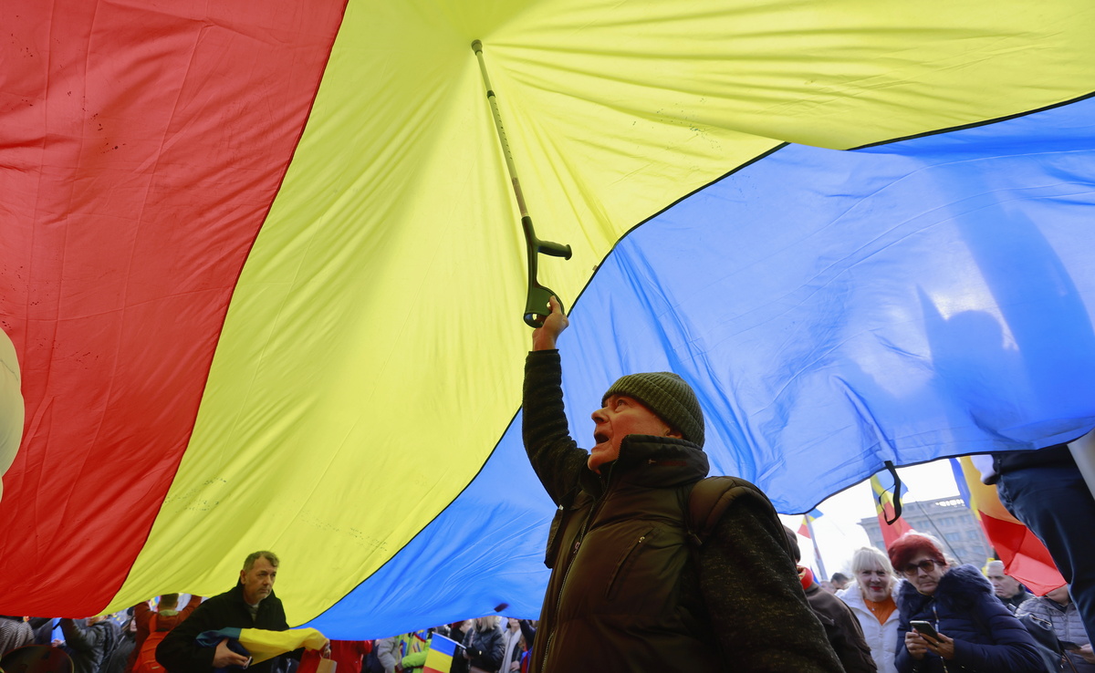 epaselect epa11816651 An elderly protester supports a part of a giant national flag with his crutch while shouting slogans during a protest against canceling the first round of presidential elections, in front of Romanian Parliament headquarters in Bucharest, Romania, 10 January 2025. Thousands of people from all over the country protest against the decision of the Constitutional Court judges to cancel the presidential elections held in December 2024. Independent presidential candidate Calin Georgescu on 16 December filed a lawsuit to the High Court of Cassation and Justice (ICCJ) to annul the decision of the Central Electoral Bureau (BEC), which suspended the second round of the presidential elections following 06 December ruling of Romanian Constitutional Court (CCR) on the annulment of the first round of elections. EPA/ROBERT GHEMENT
