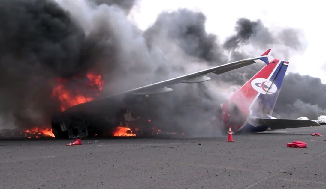 epa12078413 A handout picture made available by Houthi-run Yemen News Agency shows an Airbus aircraft of Yemenia Airways is engulfed in flames following Israeli airstrikes on Sana'a airport, in Sana'a, Yemen, 06 May 2025. Yemenia Airways has suspended its flights from and to Sana’a Airport after Israeli airstrikes destroyed the airport and three Yemenia aircraft, according to a statement by Yemenia Airways. EPA/HOUTHI YEMEN NEWS AGENCY / HANDOUT BEST QUALITY AVAILABLE HANDOUT EDITORIAL USE ONLY/NO SALES