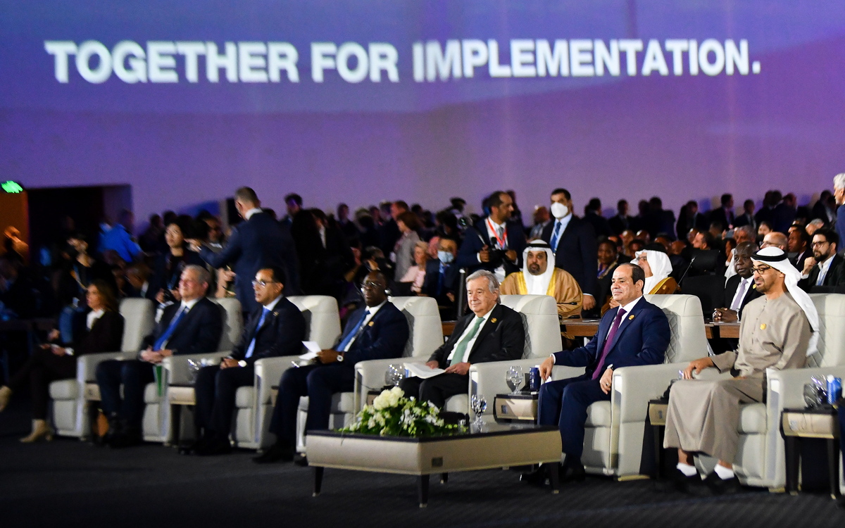 epa10292459 A handout photo made available by Egyptian Presidency shows Egyptian President Abdel Fattah al-Sisi (2-R), President of the United Arab Emirates and Ruler of the emirate of Abu Dhabi Sheikh Mohamed bin Zayed Al Nahyan (R) and United Nations Secretary General Antonio Guterres (3-R) attending the inauguration of United Nations Conference on Climate Change Conference (COP27), in Sharm El-Sheikh, in Egypt, 07 November 2022. The 2022 United Nations Climate Change Conference (COP27), running from 06 till 18 November in Sharm El-Sheikh, is expected to host one of the largest number of participants in the annual global climate conference of over 40,000 estimated attendees including heads of states and governments, civil society, media and other relevant stakeholders. The events will include Climate Implementation Summit, thematic days, flagship initiatives, and Green Zone activities engaging with climate and other global challenges. EPA/EGYPTIAN PRESIDENCY HANDOUT HANDOUT EDITORIAL USE ONLY/NO SALES