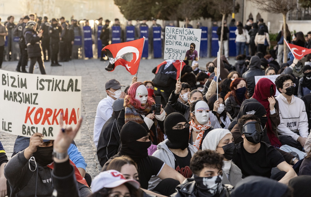epa11990167 Protesters hold a banner reading ''Our national anthem begins with 'Don't be afraid'' and shout slogans at Beyazit square during a protest against the detention of Istanbul Mayor Ekrem Imamoglu, in Istanbul, Turkey, 26 March 2025. Istanbul Mayor Ekrem Imamoglu of the Republican People's Party (CHP) was jailed and dismissed by the Turkish Ministry of Interior on 23 March on corruption charges following his detention on March 19 along with 100 others. The municipal council elected Nuri Aslan of Republican People's Party (CHP) as acting mayor on 26 March. EPA/ERDEM SAHIN