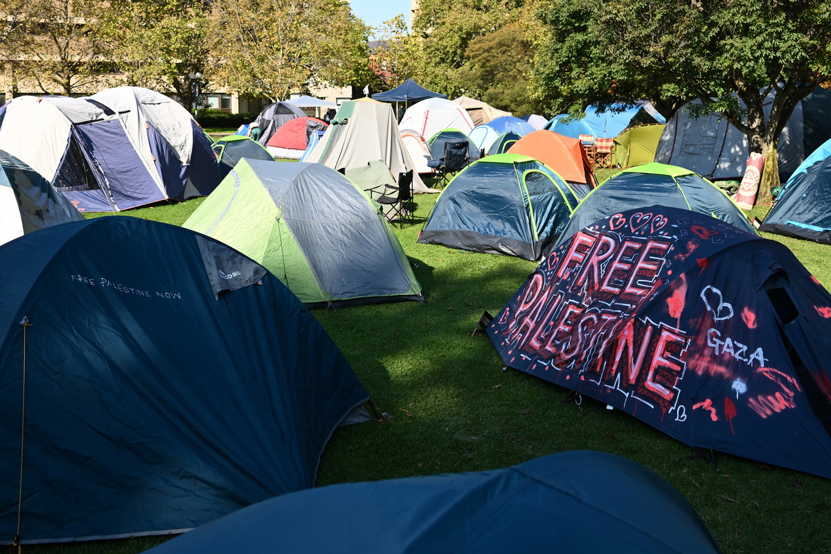 Φιλιπαλαιστίνιοι ακτιβιστές έστησαν την περασμένη εβδομάδα καταυλισμό έξω από το βασικό κτήριο του Πανεπιστημίου του Σίδνεϊ. Αντίστοιχοι καταυλισμοί στήθηκαν σε πανεπιστήμια στη Μελβούρνη, την Καμπέρα και άλλες πόλεις της Αυστραλίας.