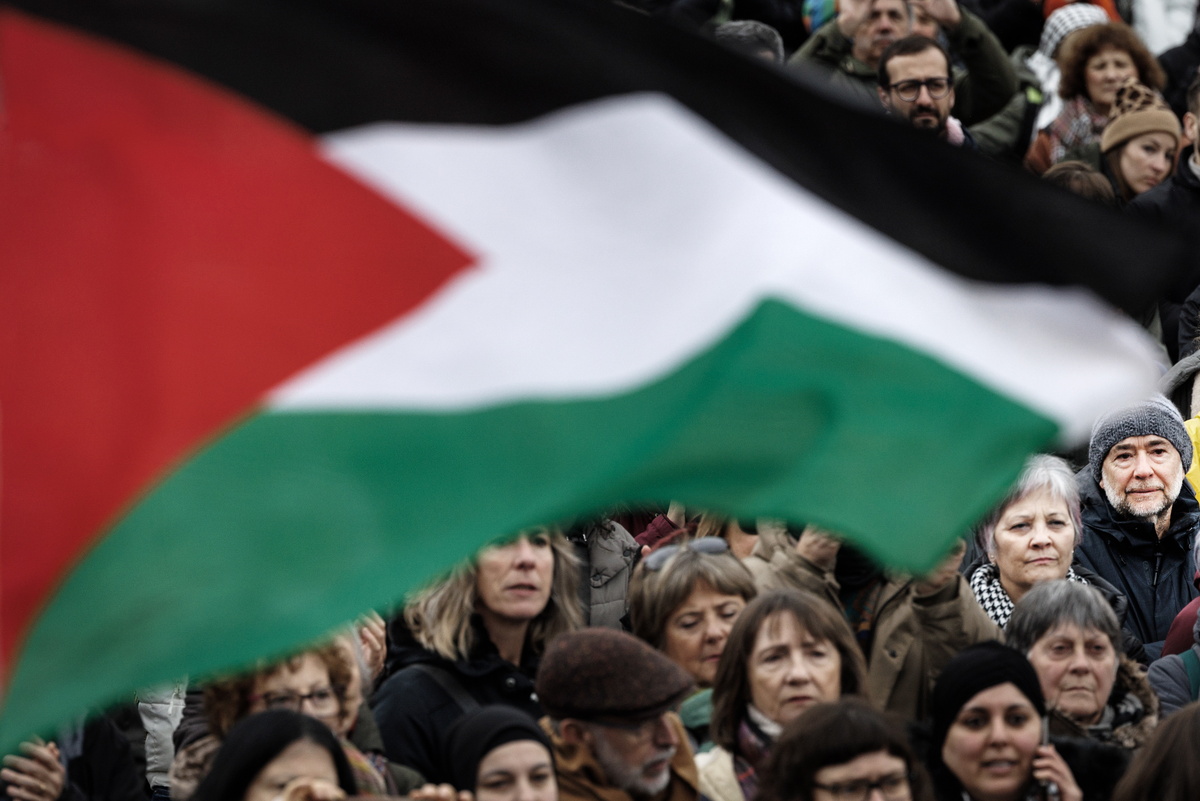 epaselect epa11180414 A Palestinian flag flutters as people attend a rally in support of the Palestinian people under the slogan 'Let's stop the genocide', in the town of Pamplona, northern Spain, 25 February 2024. Thousands of Israelis and Palestinians have been killed since the militant group Hamas launched an unprecedented attack on Israel from the Gaza Strip on 07 October 2023, and the Israeli strikes on the Palestinian enclave which followed it. EPA/VILLAR LOPEZ