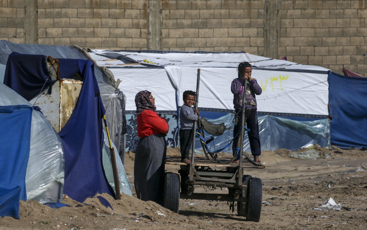 epa11120457 An internally displaced Palestinian family who fled from the northern Gaza Strip, stand outside their tent in the west of Khan Younis town, southern Gaza Strip, 02 February 2024. Since 07 October 2023, up to 1.9 million people, or more than 85 percent of the population, have been displaced throughout the Gaza Strip, some more than once, according to the United Nations Relief and Works Agency for Palestine Refugees in the Near East (UNRWA), which added that most civilians in Gaza are in 'desperate need of humanitarian assistance and protection'. EPA/MOHAMMED SABER