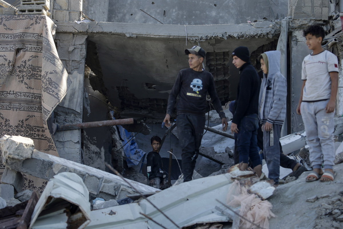 epa11037374 Palestinians inspect a destroyed house following an Israeli air strike in the east of Deir al Balah town, Gaza Strip, 19 December 2023. More than 60 members of two families were killed after an Israeli airstrike, the Palestinian Civil Defense said. Israeli forces resumed military strikes on Gaza after a week-long truce expired on 01 December. More than 15,000 Palestinians and at least 1,200 Israelis have been killed, according to the Gaza Government media office and the Israel Defense Forces (IDF), since Hamas militants launched an attack against Israel from the Gaza Strip on 07 October, and the Israeli operations in Gaza and the West Bank which followed it. EPA/MOHAMMED SABER
