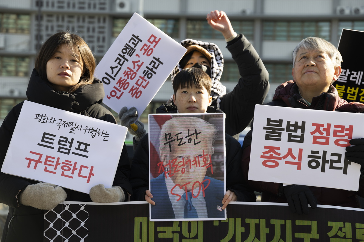 epaselect epa11878060 Members of Action4Palestine Korea shout slogans and hold placards stating objection to US President Donald J. Trump's Gaza plan during a rally in front of the US Embassy in Seoul, South Korea, 06 February 2025. EPA/JEON HEON-KYUN