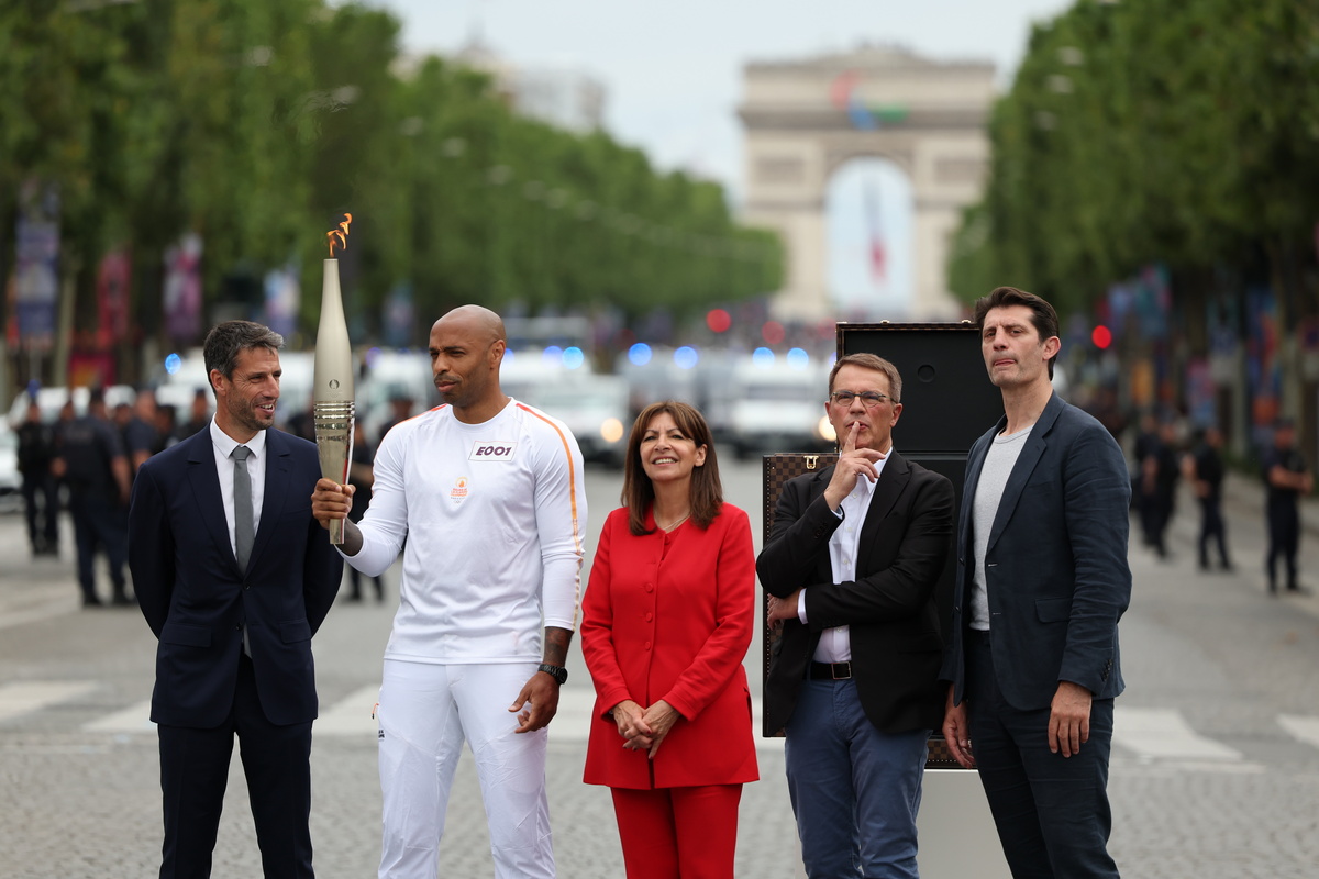 epa11477214 Thierry Henry holds the Paris 2024 Olympic flame with Mayor of Paris, Anne Hidalgo and CIO President, Tony Estanguet as the Olympic Torch Relay arrives in Paris, France, 14 July 2024. The Olympic torch relay arrived in Paris on Bastille Day, the country's national holiday, and will visit some of the city's most famous landmarks on 14 and 15 July. In May 2024, the Olympic flame began its journey across France, including five overseas regions, visiting hundreds of towns and cities before the Olympic Games Opening Ceremony on 26 July. EPA/JULIEN MATTIA