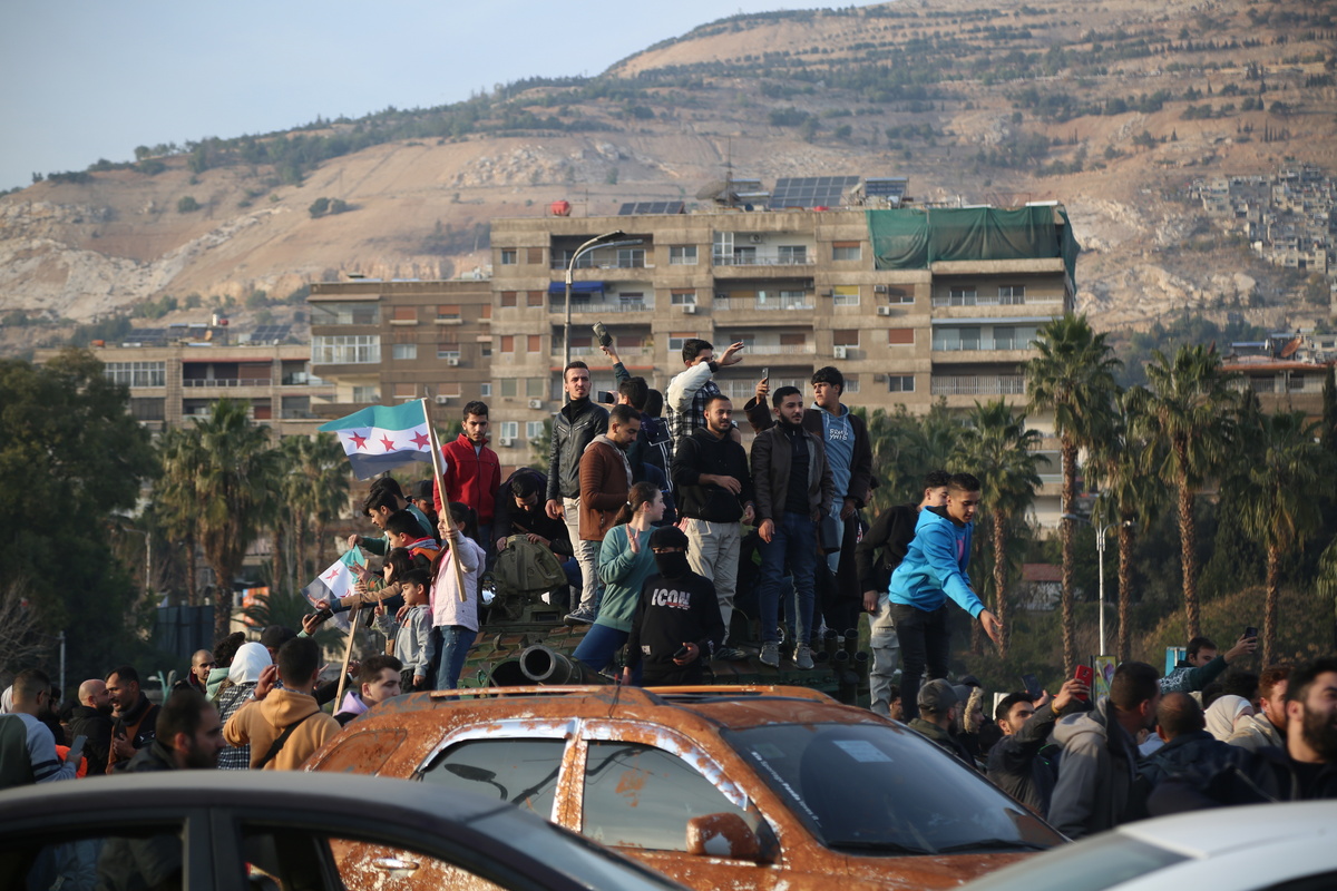 epaselect epa11766948 People celebrate the overthrow of Syrian President al-Assad, at the Umayyad Square in Damascus, Syria, 09 December 2024. Syrian rebels entered Damascus on 08 December 2024 and announced in a televised statement the 'Liberation of the city of Damascus and the overthrow of Bashar al-Assad', as well as the release of all the prisoners. EPA/BILAL AL HAMMOUD
