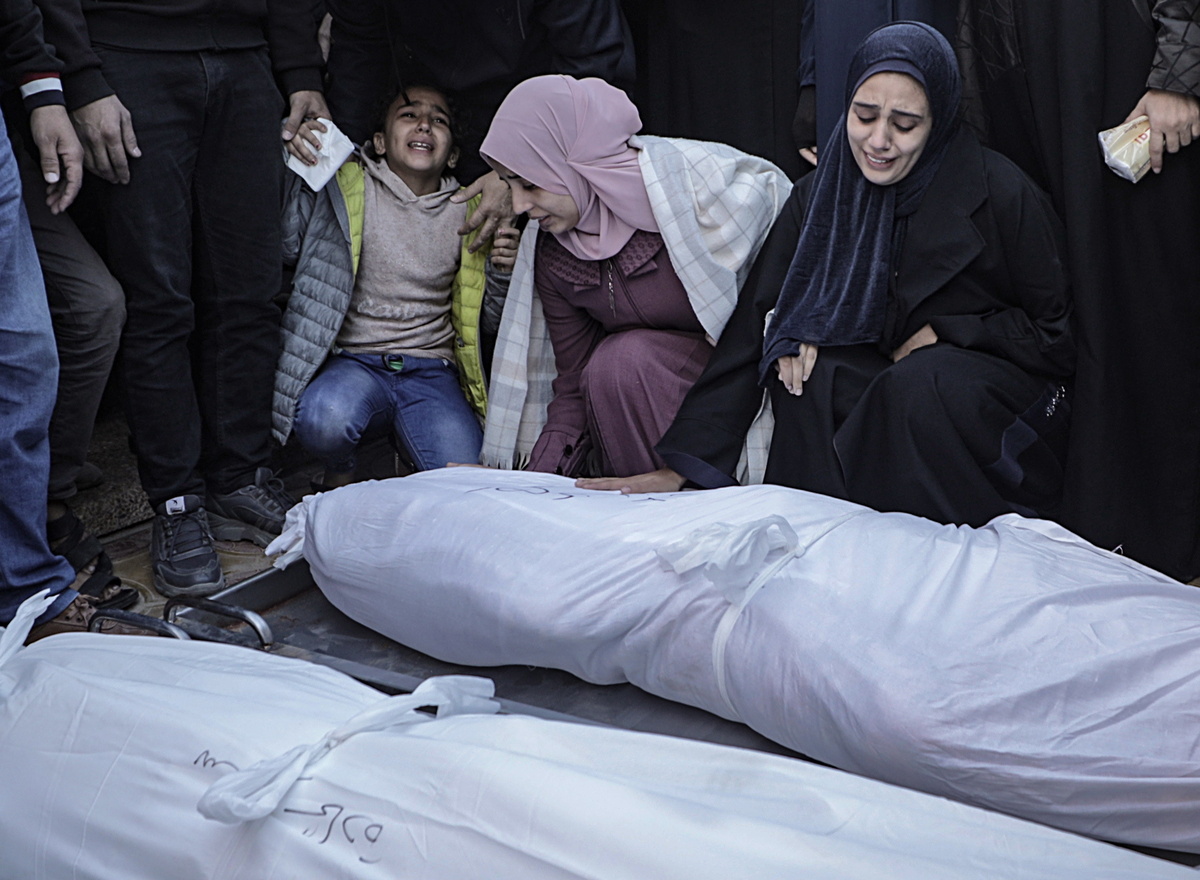 epa10987107 Relatives of Palestinians who were killed following Israeli air strikes on a building housing displaced people from the Gaza Strip, mourn next to their bodies lying outside Nasser Hospital in Khan Yunis, southern Gaza Strip, 21 November 2023. More than 12,500 Palestinians and at least 1,200 Israelis have been killed, according to the Israel Defense Forces (IDF) and the Palestinian health authority, since Hamas militants launched an attack against Israel from the Gaza Strip on 07 October, and the Israeli operations in Gaza and the West Bank which followed it. EPA/HAITHAM IMAD