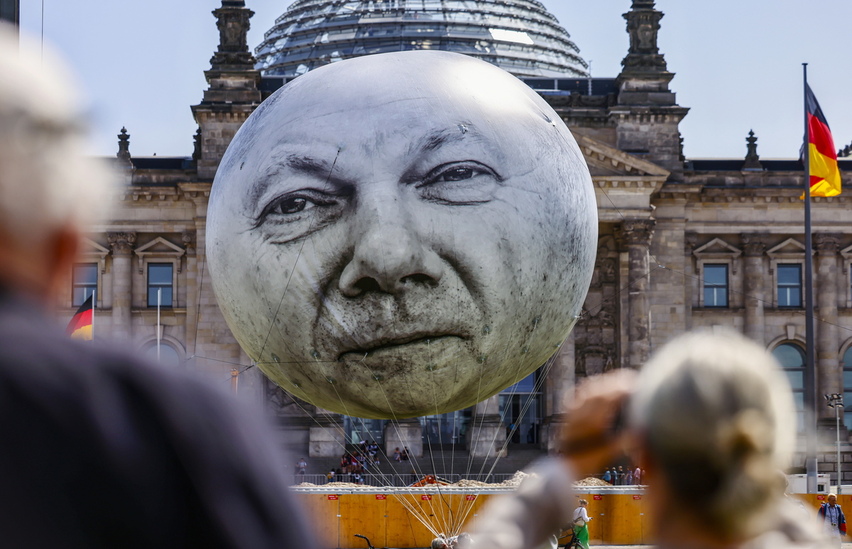 epa10723874 A large balloon with the face of the German Chancellor Olaf Scholz floats in front of the Reichstag building in Berlin, Germany, 03 July 2023. Activists of ONE, a global campaign and advocacy organisation committed to ending extreme poverty, protest against planned German budget cuts for development aid. EPA/HANNIBAL HANSCHKE