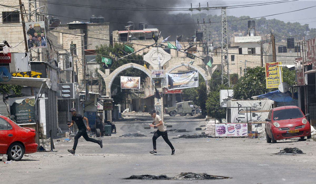 epa10723550 Palestinians run for cover amid clashes during an Israeli military operation in Jenin, West Bank, 03 July 2023. The Israel Defense Forces (IDF) announced on 03 July that they launched a large-scale operation in Jenin. According to the Palestinian Health Ministry, at least seven people were killed and dozens of others wounded in the Jenin raid, adding that the death toll was likely to rise. EPA/ALAA BADARNEH
