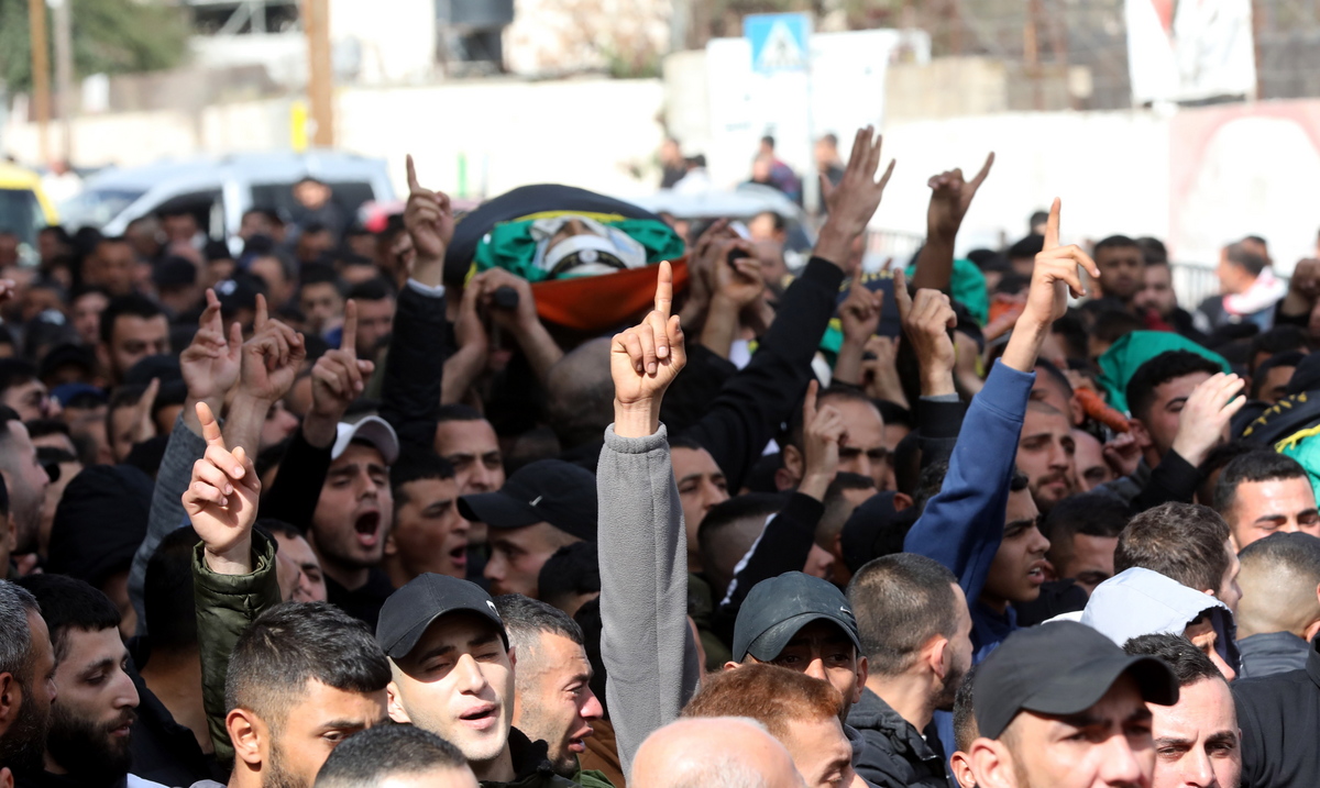 epa10511352 Mouners react as they carry the body of one of the three militants killed by Israeli forces during their funeral in the West Bank city of Jenin, 09 March 2023. Israeli forces killed three Palestinians in Jaba on 09 March, the Palestinian Health Ministry said in a statement without giving further details. Israeli forces said they conducted a number of overnight activities in the West Bank. EPA/ALAA BADARNEH