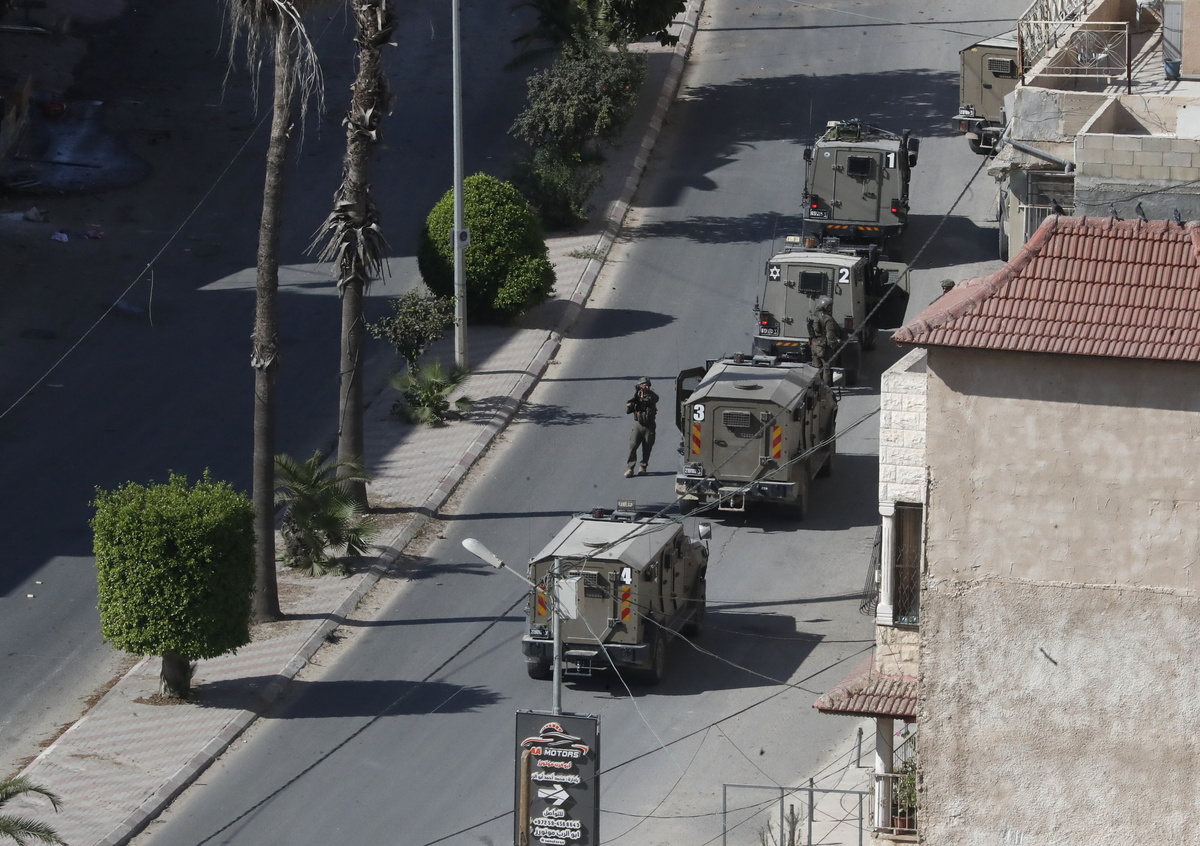 epa11587395 Israeli military patrol the streets amid the ninth day of an ongoing military operation in the West Bank city of Jenin, 05 September 2024. According to the Palestinian Health Ministry, at least 39 Palestinians have been killed since Israeli military operations started on 28 August 2024 in the West Bank cities of Tulkarem, Jenin, and Tubas. The Israeli army said that it's conducting a large-scale 'counterterrorism operation' in several areas. EPA/ALAA BADARNEH
