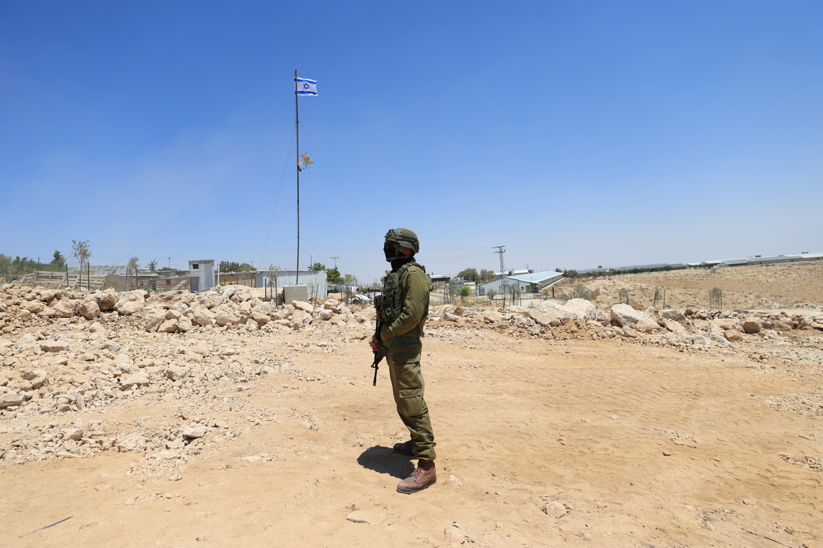 epa12275315 An Israeli soldier stands guard in Khirbet Umm Al-Khair, Hebron governorate, West Bank, 31 July 2025. According to the Palestinian Ministry of Health, Palestinian teacher and human rights activist Odeh Al-Hathalin, 31, succumbed to his wounds after being shot on 28 July by an Israeli settler while reportedly trying to prevent the bulldozing of Palestinian lands in the village. EPA/ALAA BADARNEH
