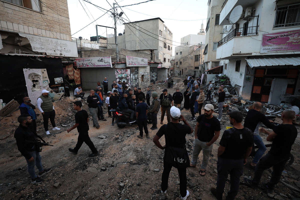 epa10965747 Palestinians inspect a damaged area inside the Jenin refugee camp following an Israeli raid, in the West Bank city of Jenin, 09 November 2023. According to the Palestinian Health Ministry, two Palestinians were killed by Israeli fire close to Bethlehem and Hebron, respectively. Since 07 October 2023, more than 160 Palestinians have been killed, while over 2,000 have sustained injuries in the West Bank. EPA/ALAA BADARNEH