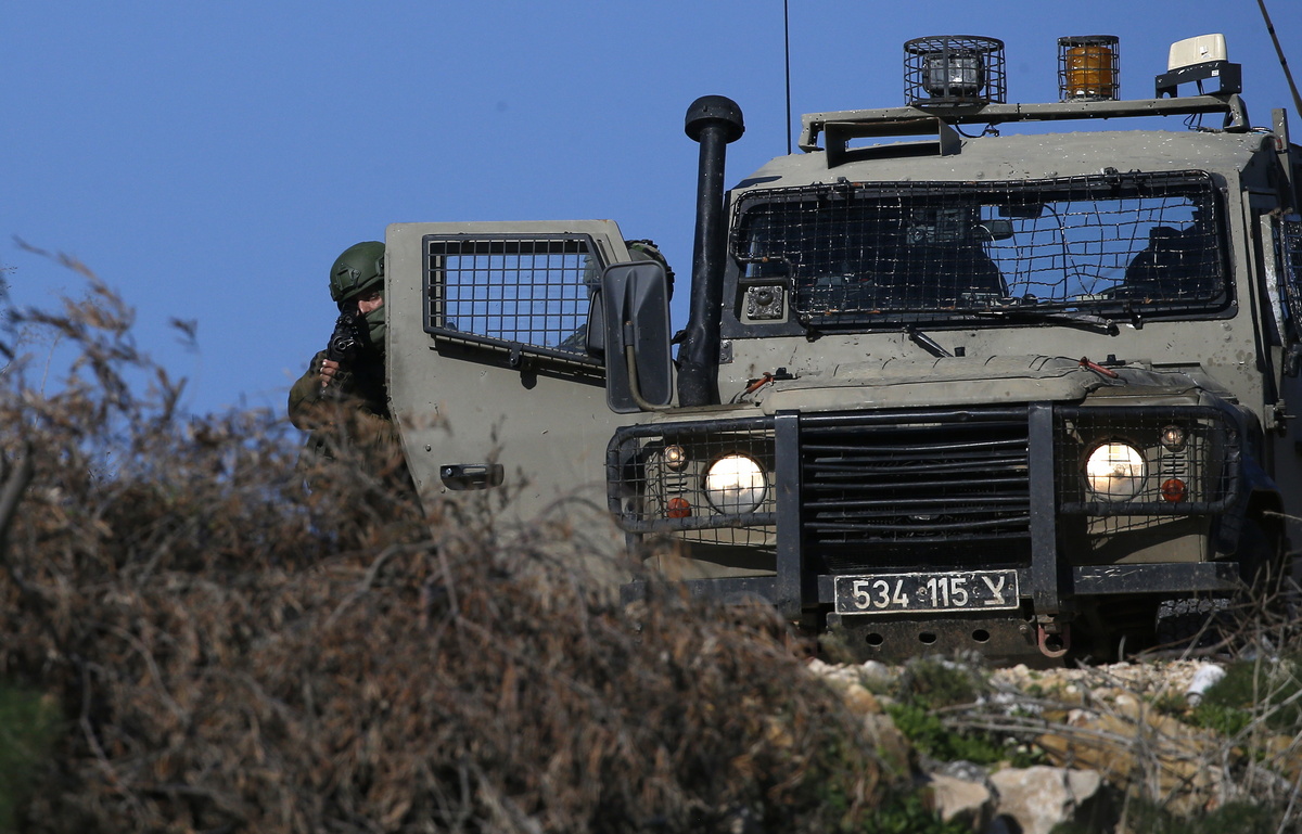 epa11048149 An Israeli soldier takes position next to a military vehicle during an Israeli army raid in Al-Far'a refugee camp, near the West Bank city of Tubas, 29 December 2023. At least seven Palestinians were wounded during an Israeli military raid on the refugee camp, the Palestinian Health Ministry said. EPA/ALAA BADARNEH