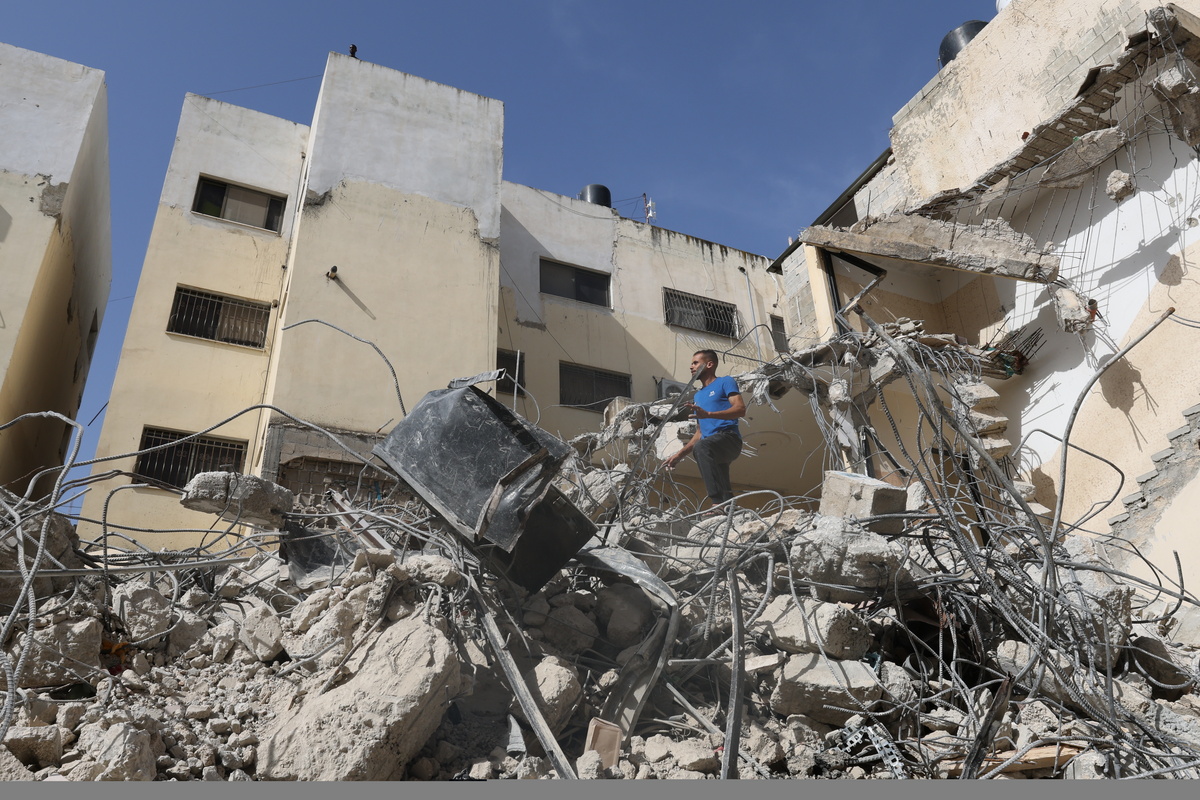 epa11362131 A Palestinian inspects the rubble of a building after an Israeli army operation in the Jenin refugee camp, West Bank, 23 May 2024. The Israeli Army annouced on 23 May the end of its "anti-terror" military operation in the West Bank city of Jenin. According to the Palestinian Health Ministry at least 12 people were killed and 25 others were injured following the operation which started on 21 May. EPA/ALAA BADARNEH