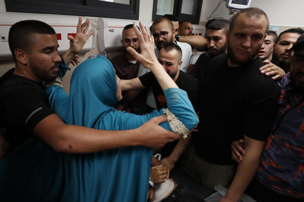epa11394032 Relatives of a Palestinian man who died during an Israeli raid raid in the Jenin refugee camp react next to his body at the morgue of the Jenin Hospital in the West Bank city of Jenin, 06 June 2024. At least three Palestinians were killed and at nine others injured during an Israeli army operation in the West Bank city of Jenin and its camp, the palestinian health ministry confirmed on 06 June. EPA/ALAA BADARNEH