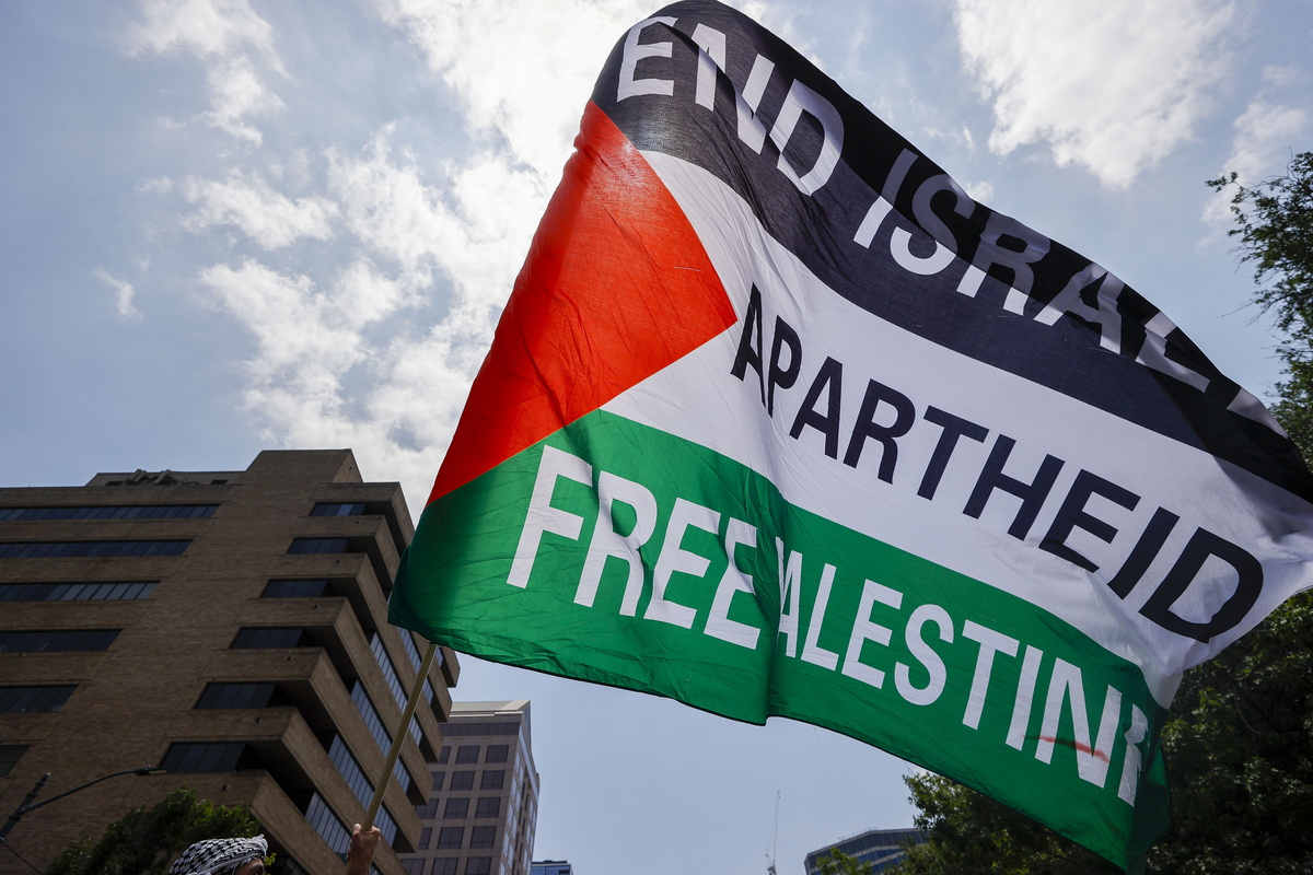 epa11354431 A protestor waves a Palestinian flag during a Palestine Nakba Day protest at the Texas State Capitol in Austin, Texas, USA, 19 May 2024. More than 35,000 Palestinians and over 1,400 Israelis have been killed, according to the Palestinian Health Ministry and the Israel Defense Forces (IDF), since Hamas militants launched an attack against Israel from the Gaza Strip on 07 October 2023, and the Israeli operations in Gaza and the West Bank which followed it. EPA/ADAM DAVIS